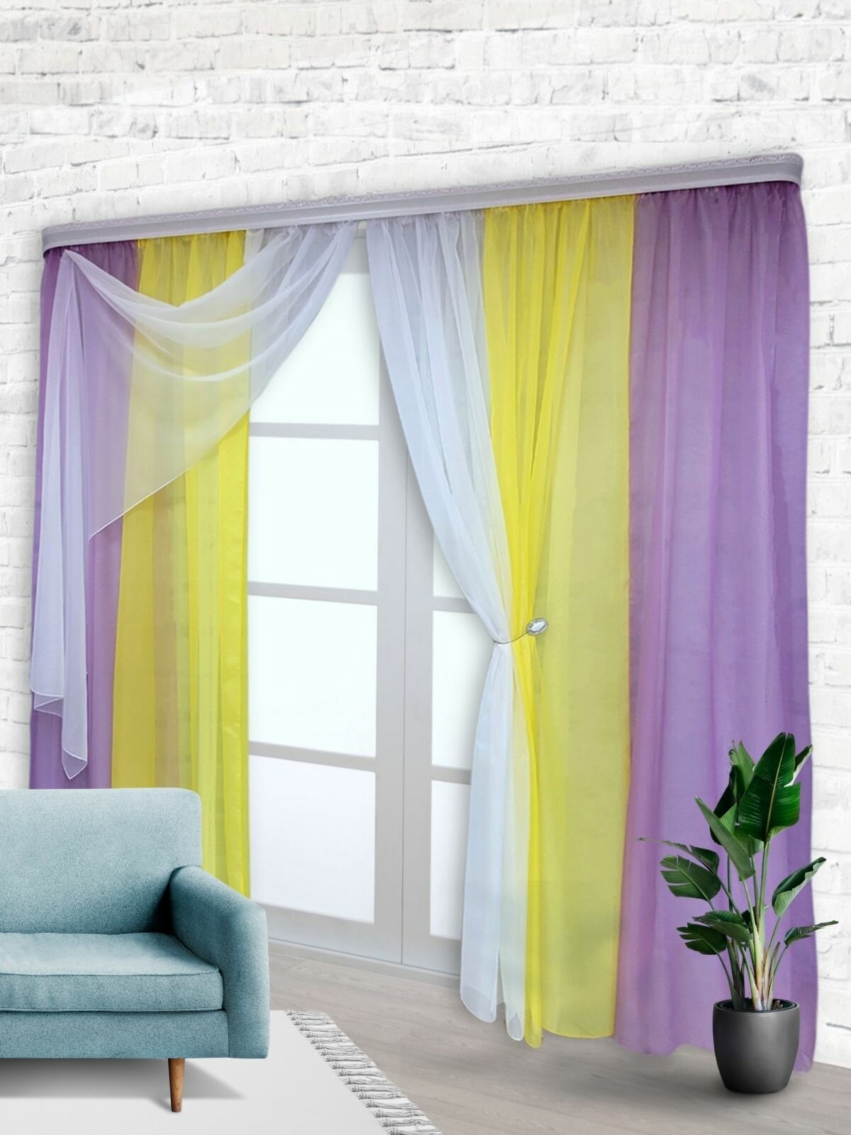 Купить Шторы для комнаты комплект тюль вуаль "Радуга" сиреневый/желтый, высота 250см
