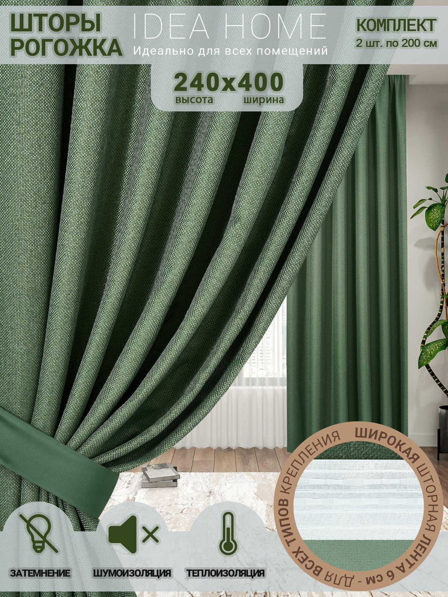 СохранитьКомплект штор блэкаут 400х240 2 шт по 200 см , IDEA HOME / затемнение более 90% , рогожка однотонный зеленый интересное: