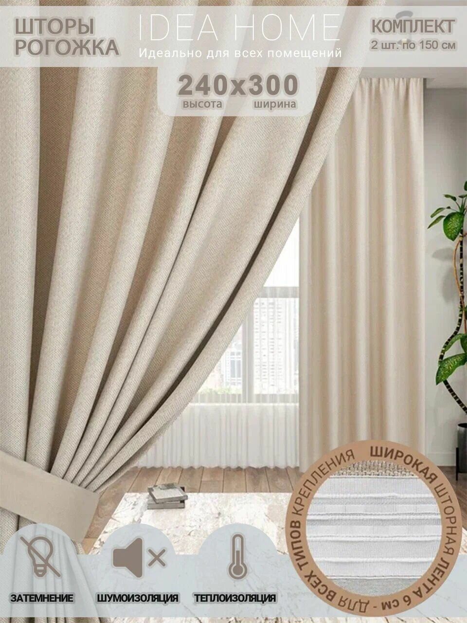Комплект штор блэкаут 300х260 2 шт по 150 см , IDEA HOME / затемнение более 90% , рогожка однотонный бежевый