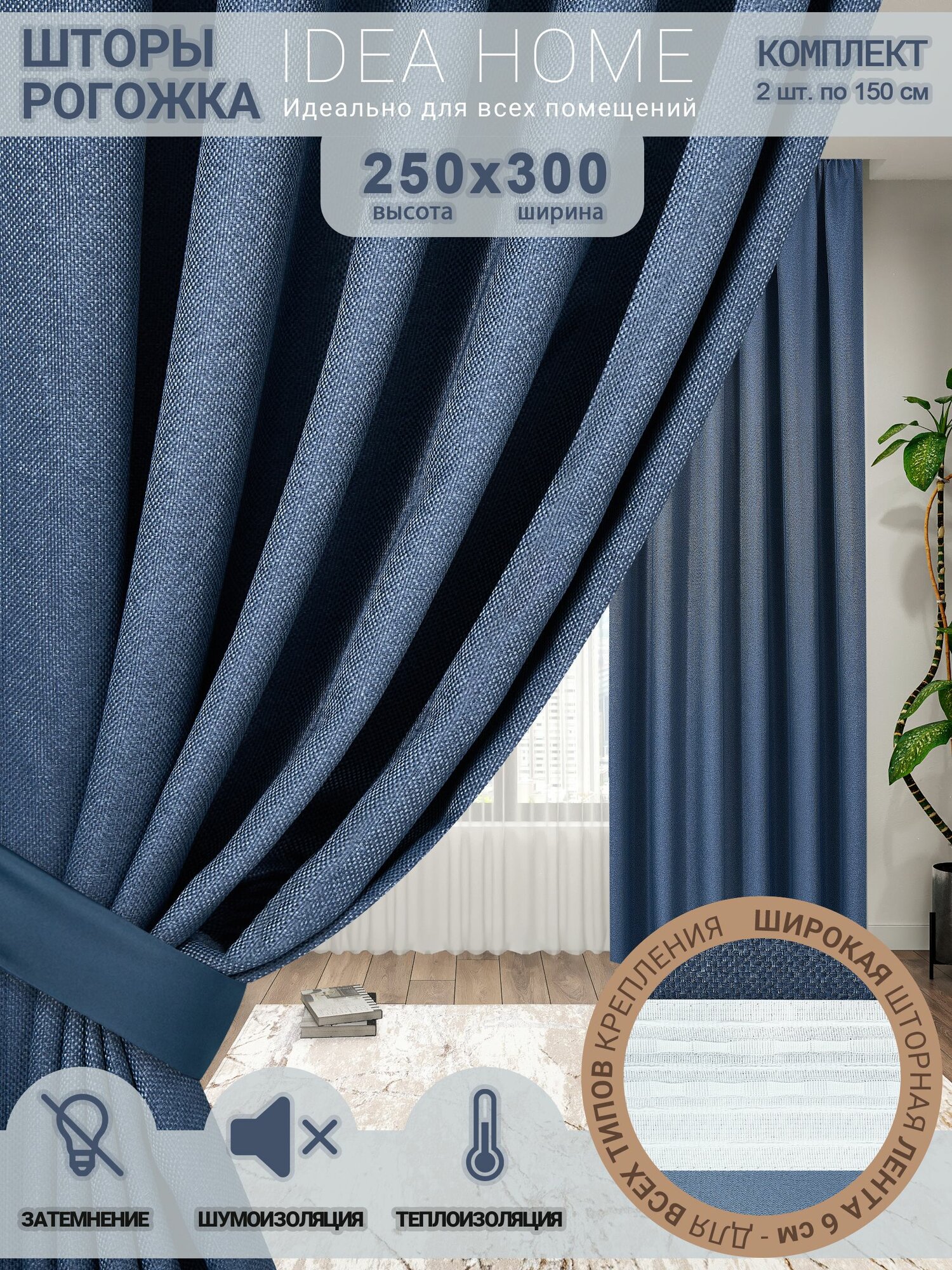 СохранитьКомплект штор блэкаут 300х250 2 шт по 150 см , IDEA HOME / затемнение более 90% , рогожка однотонный синий интересное: