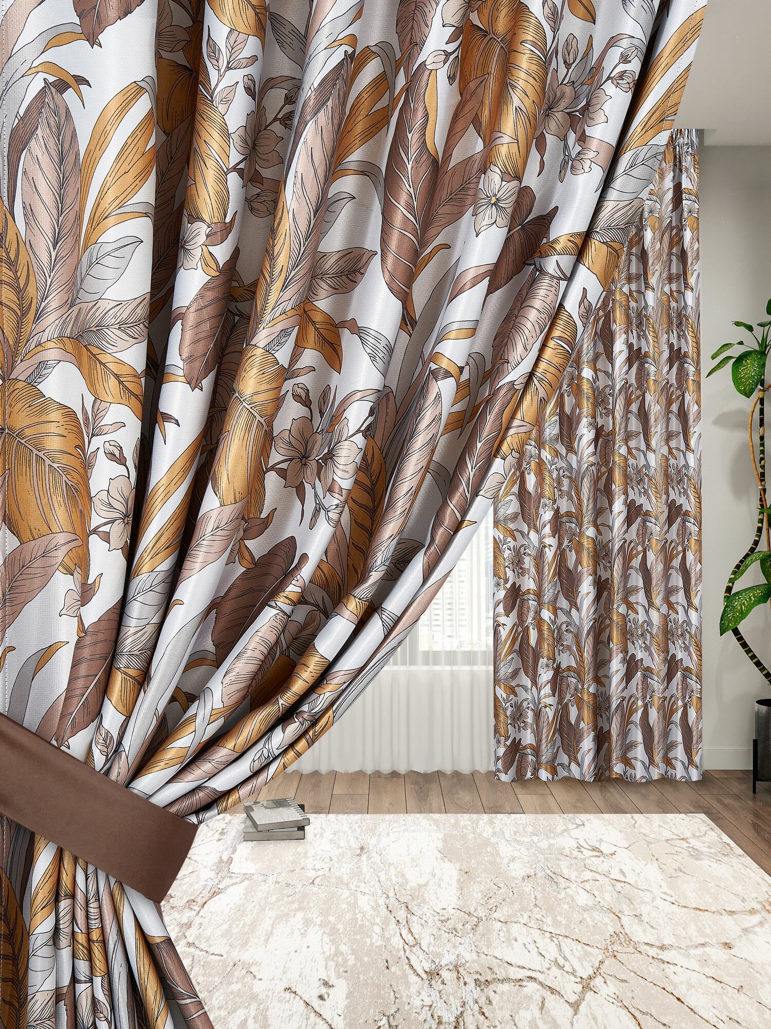 Комплект штор блэкаут 300х270 2 шт по 150 см , IDEA HOME / затемнение более 90% , рогожка коричневый цветочный принт
