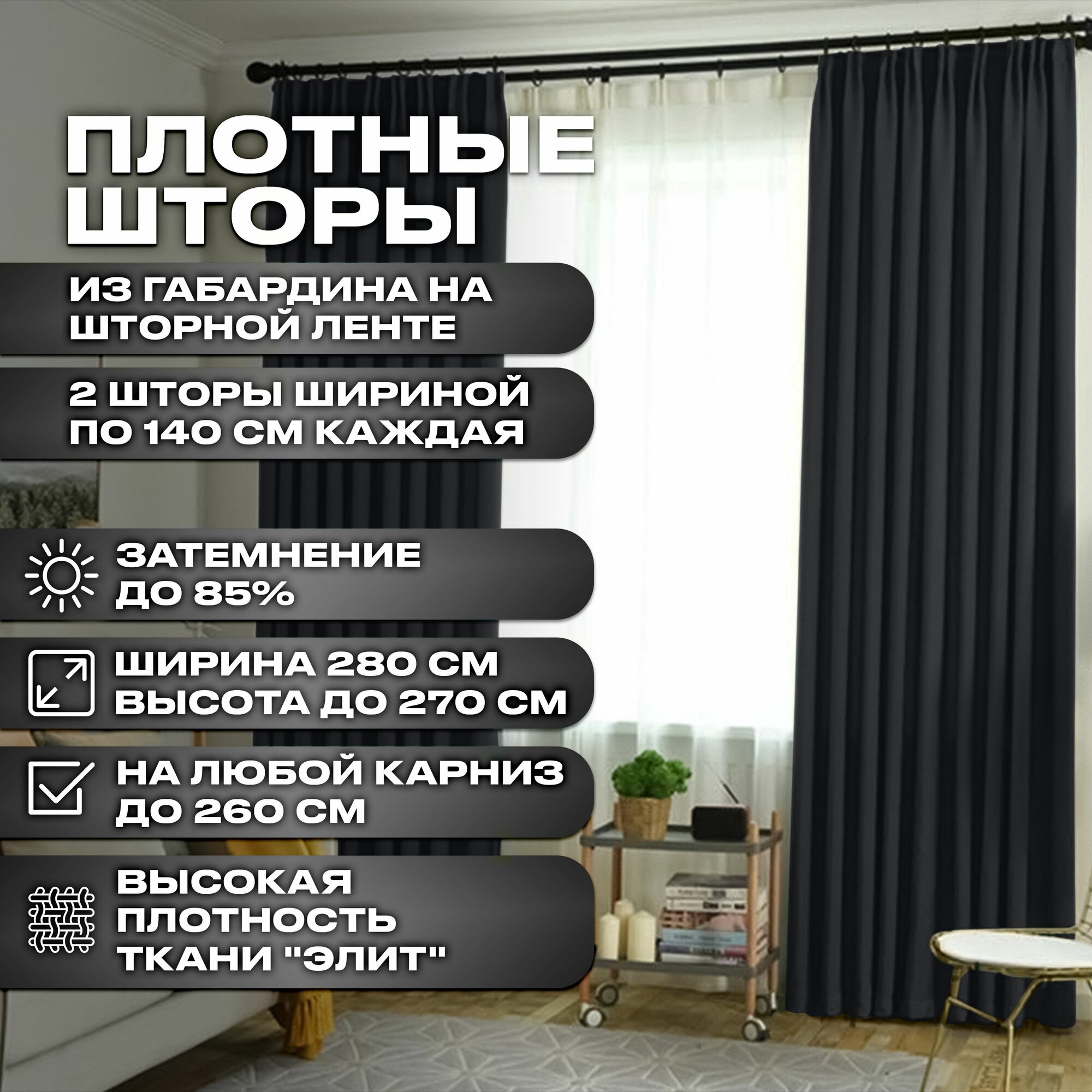 Плотные шторы из Габардина для высоких окон цвет черный 2 шторы ( шир 140см х выс 280 см)арт- ГН-1