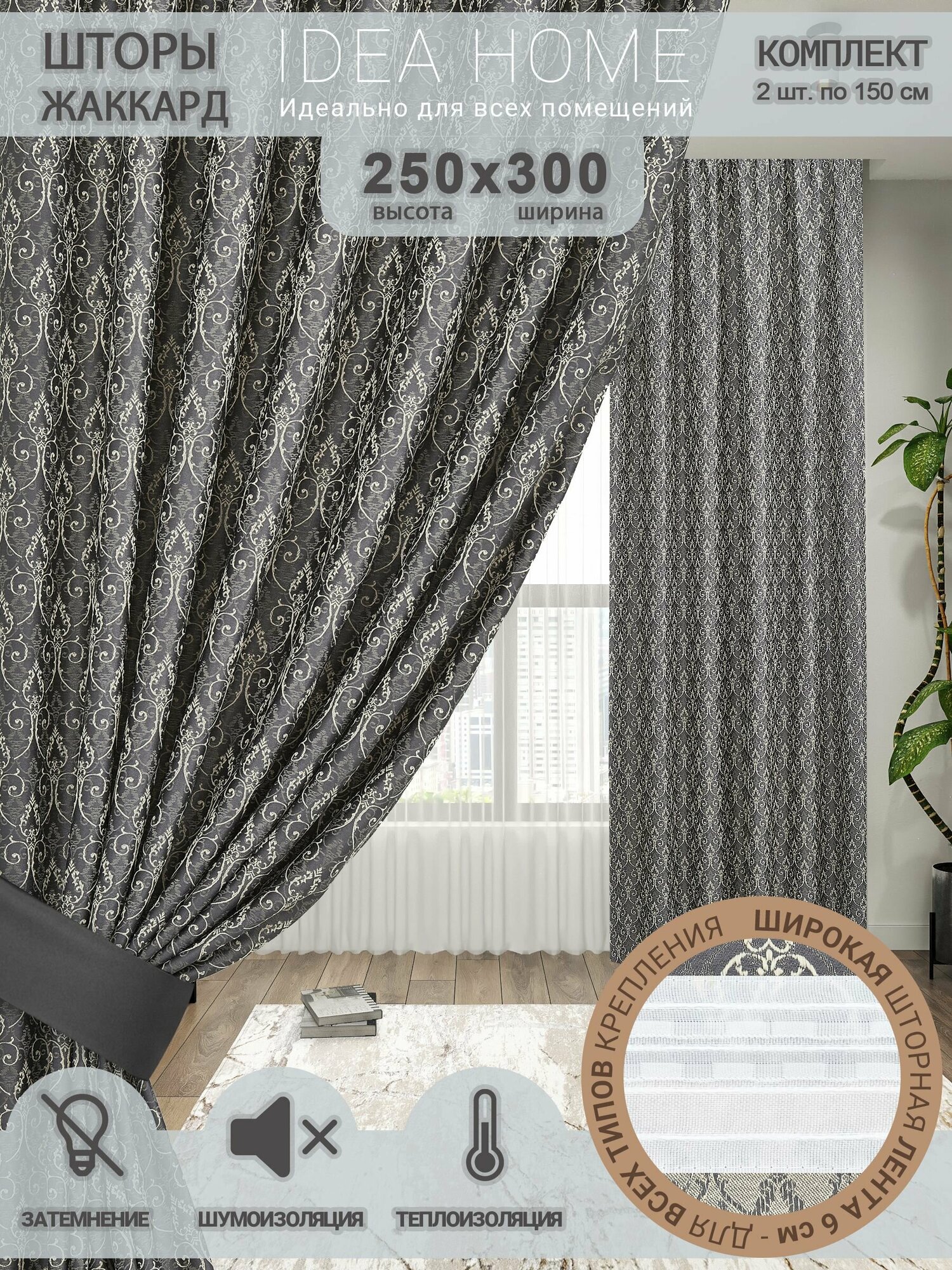 Купить Шторы комнатные IDEA HOME/комплект из 2 шт по 150 см/ портьеры для комнаты, кухни, спальни, гостиной и дачи 250х300см/ французский жаккард/ серый
