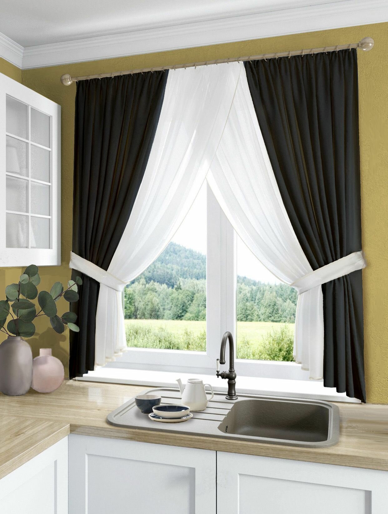 Купить Кухонные шторы из плотной ткани блэкаут и тюля КУ-БК-ГЕР-211 цвет черный