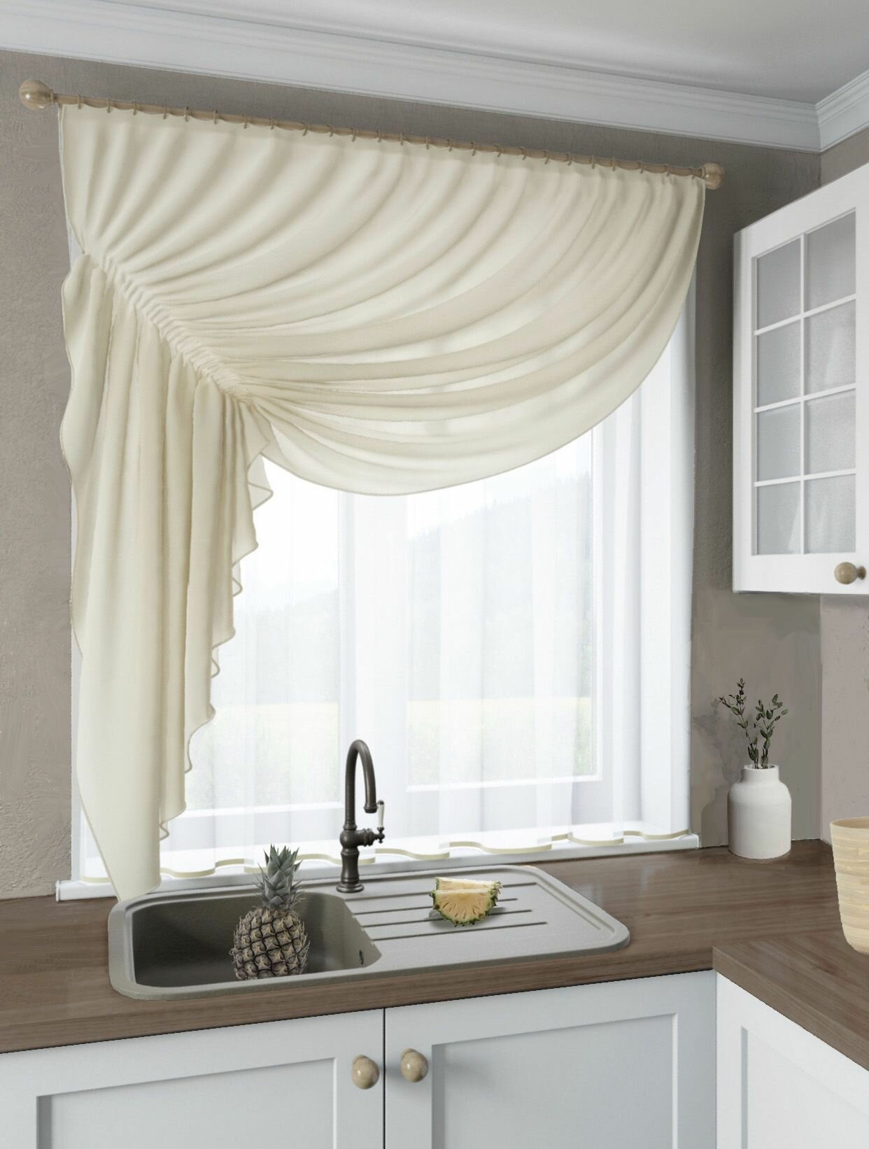 Кухонные шторы из тюля на ленте под крючки КУ-АГН-54 цвет бежевый