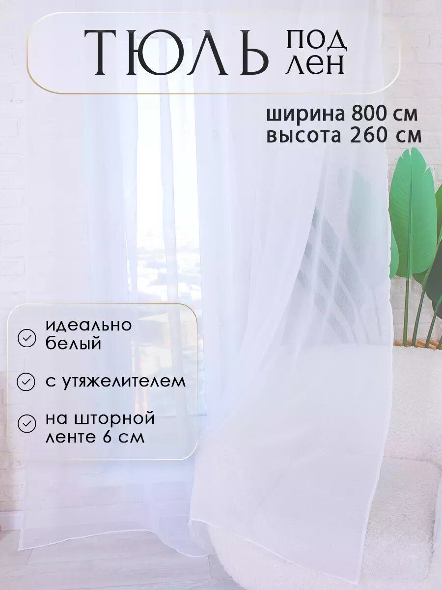 Купить Тюль Мир Штор, под лен с утяжелителем, белый, на шторной ленте, ширина 8м