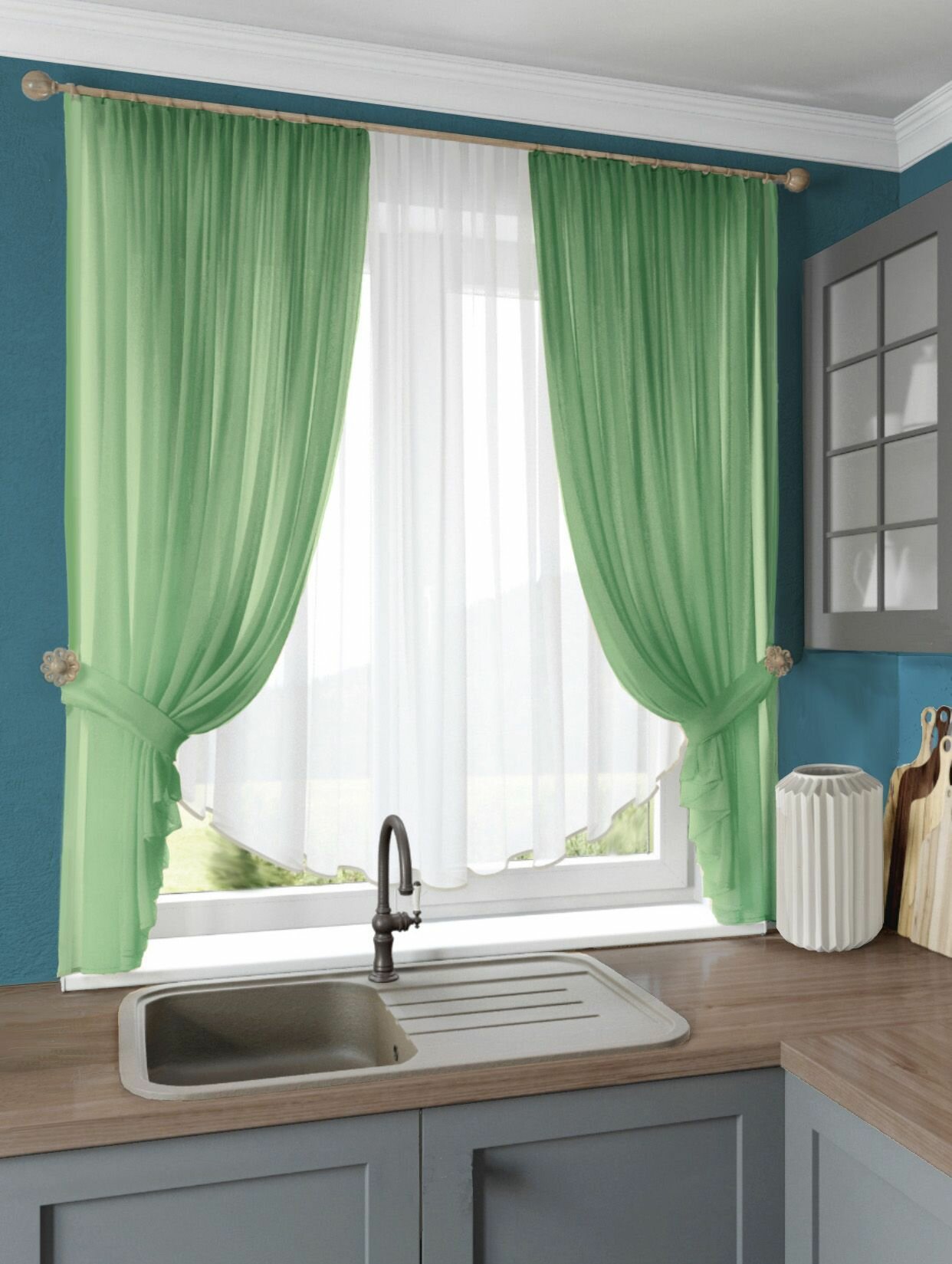 Купить Кухонные шторы из цветного тюля и белого тюля на ленте под крючки КУ-ТУП-980 цвет зеленый