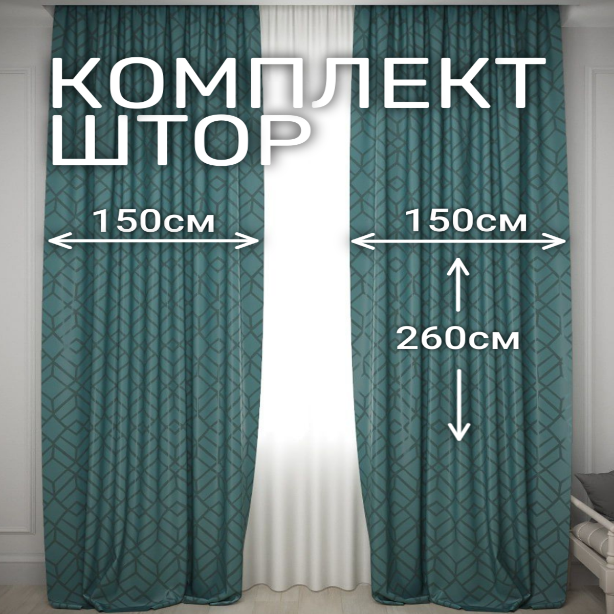 Шторы 2 шт. по 150см, Комплект штор Геометрия ширина 300см, высота 260см, изумрудный с серым интересное: