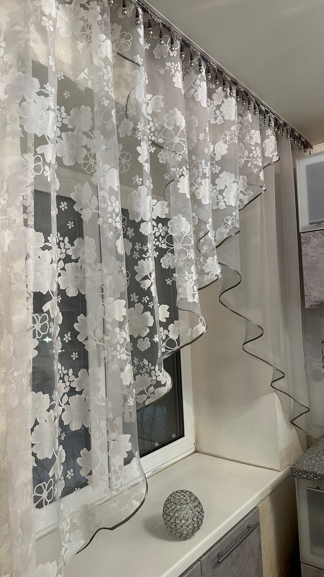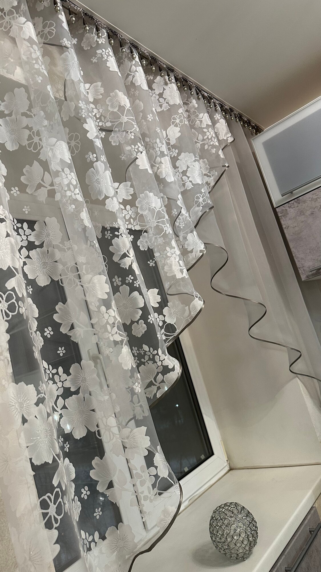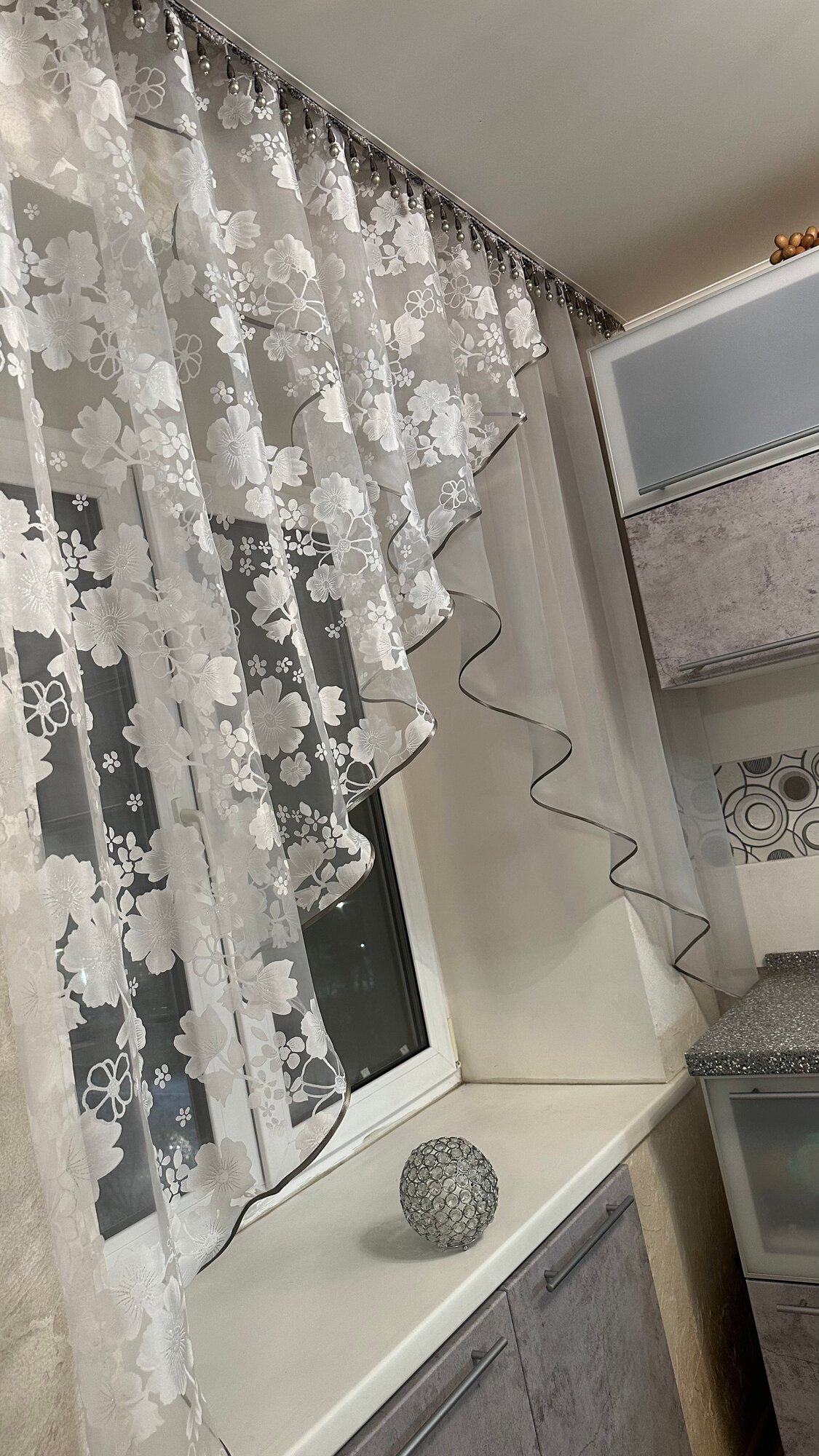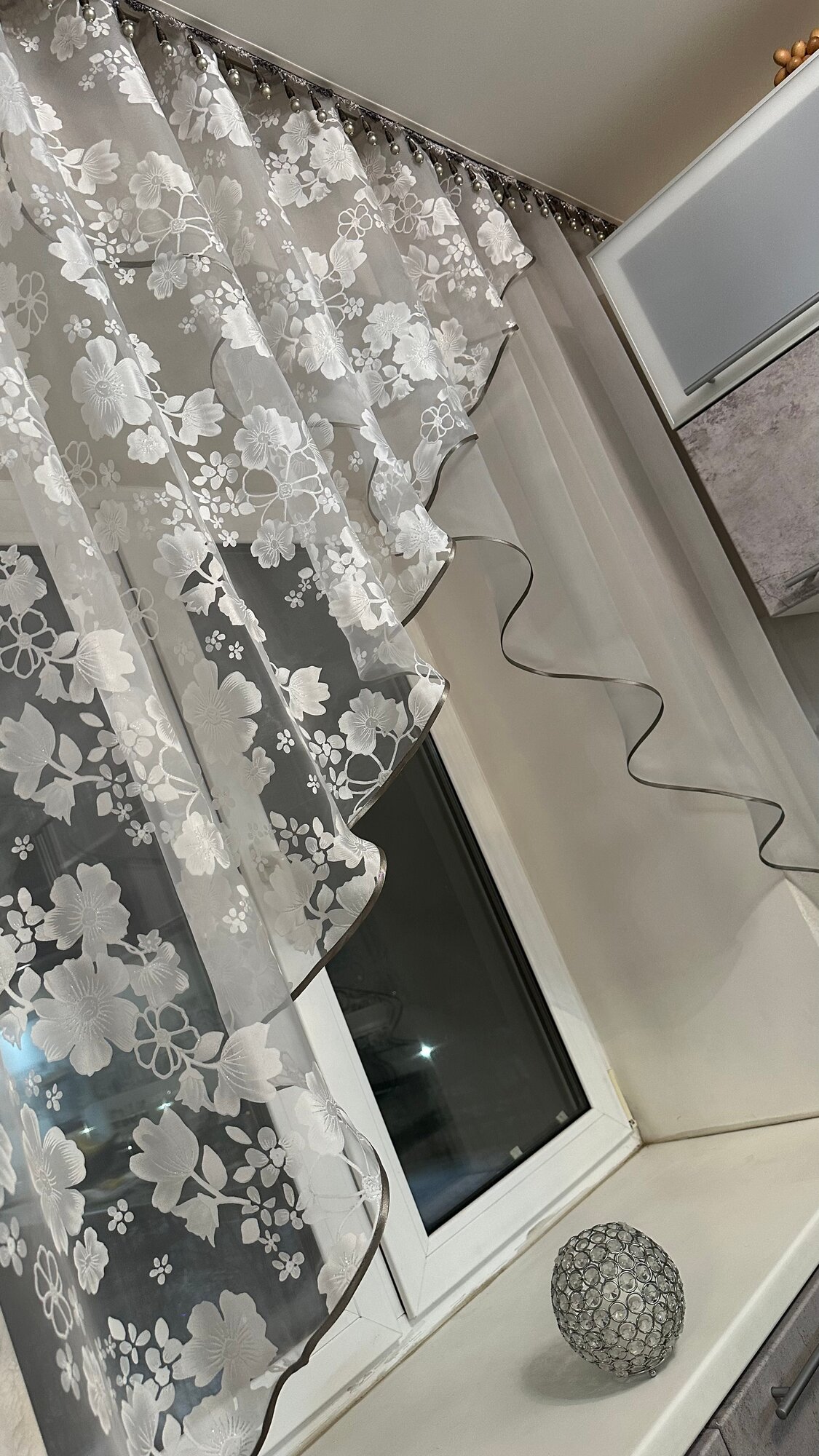 СохранитьКухонная шторка серая с белыми цветами, ширина 3м, высота 1,7м интересное:
