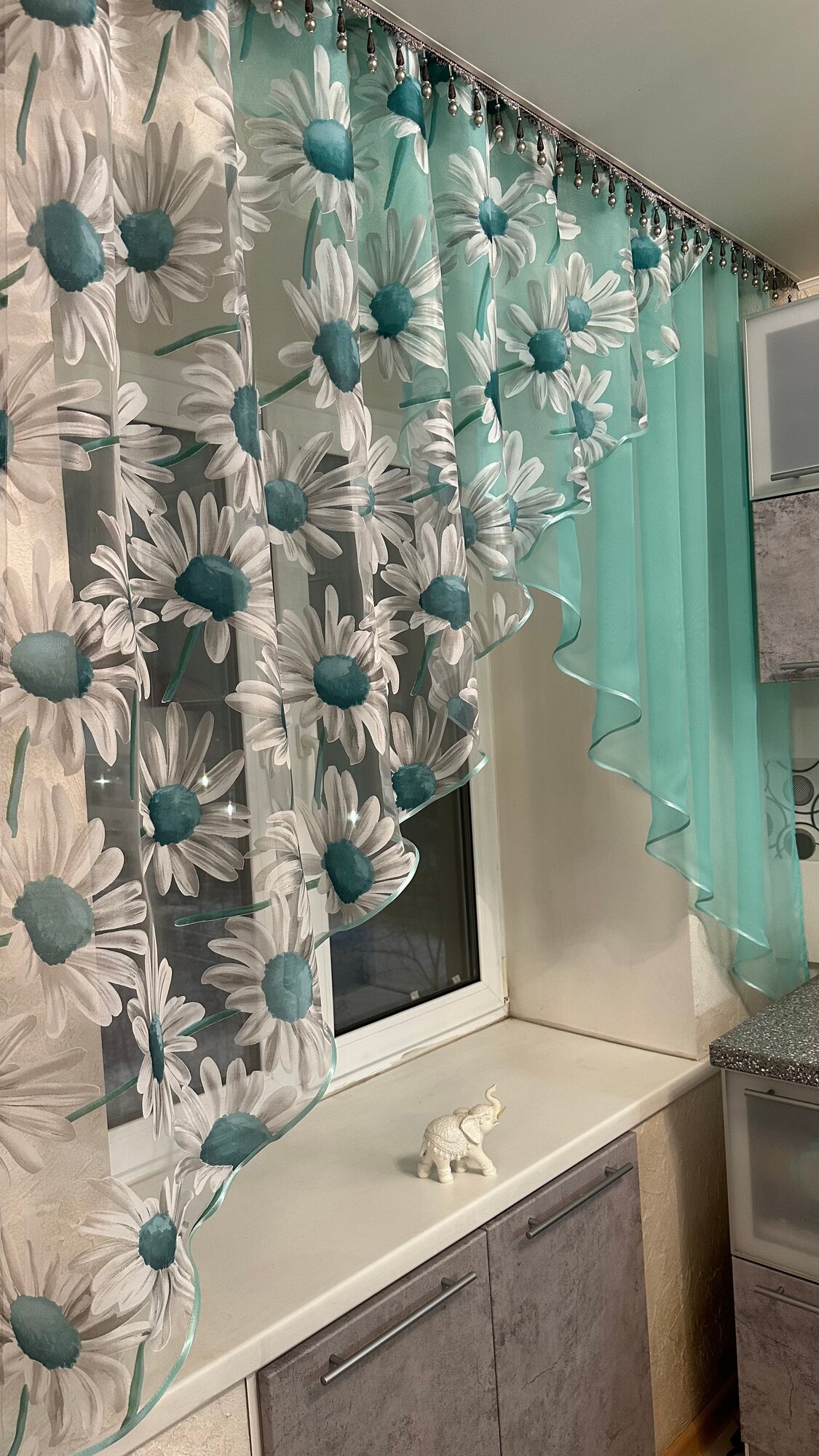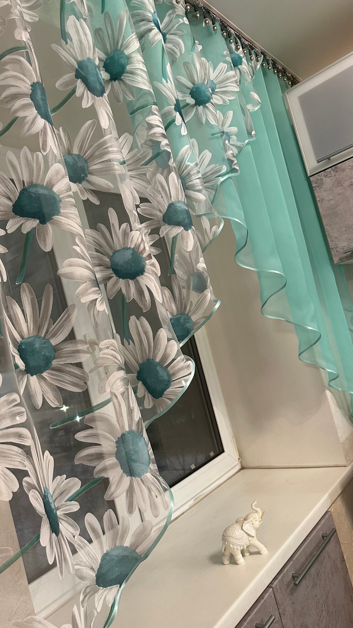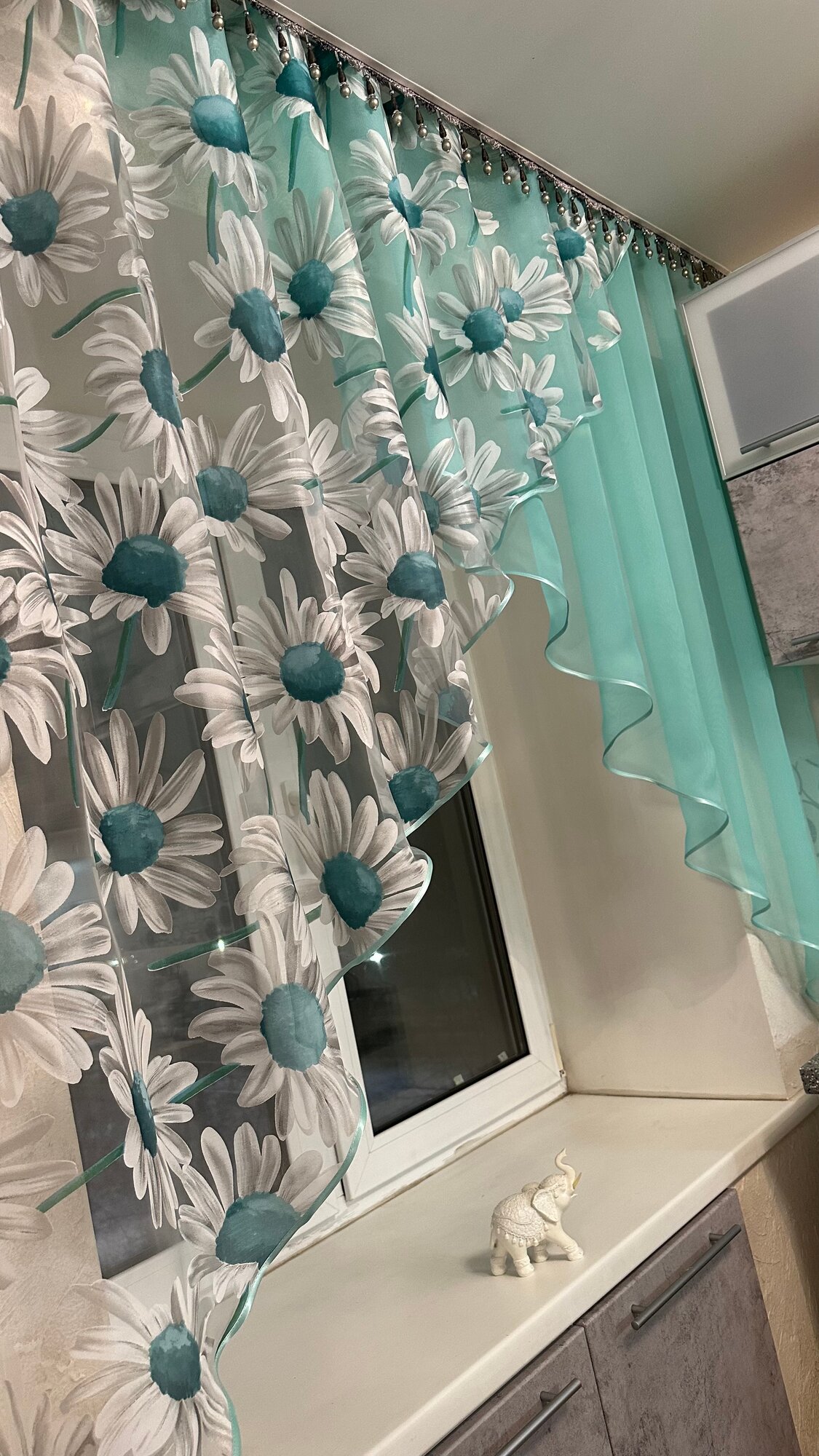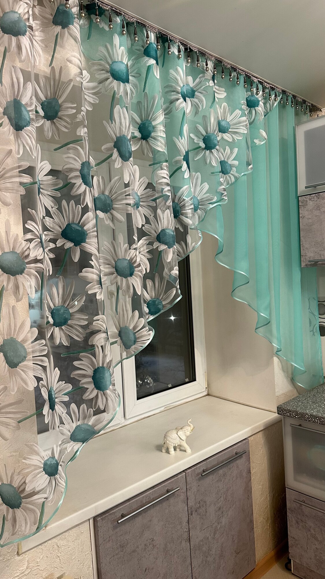 СохранитьКухонная шторка ромашка ярко-бирюзовая, ширина 3м, высота 1,7м интересное: