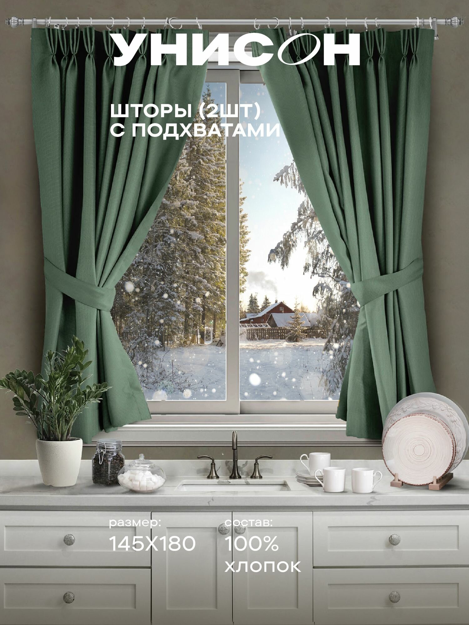Комплект штор с подхватом рогожка 150х180 (2 шт.) "Унисон" рис 30004-20 Basic серо-зеленый интересное: