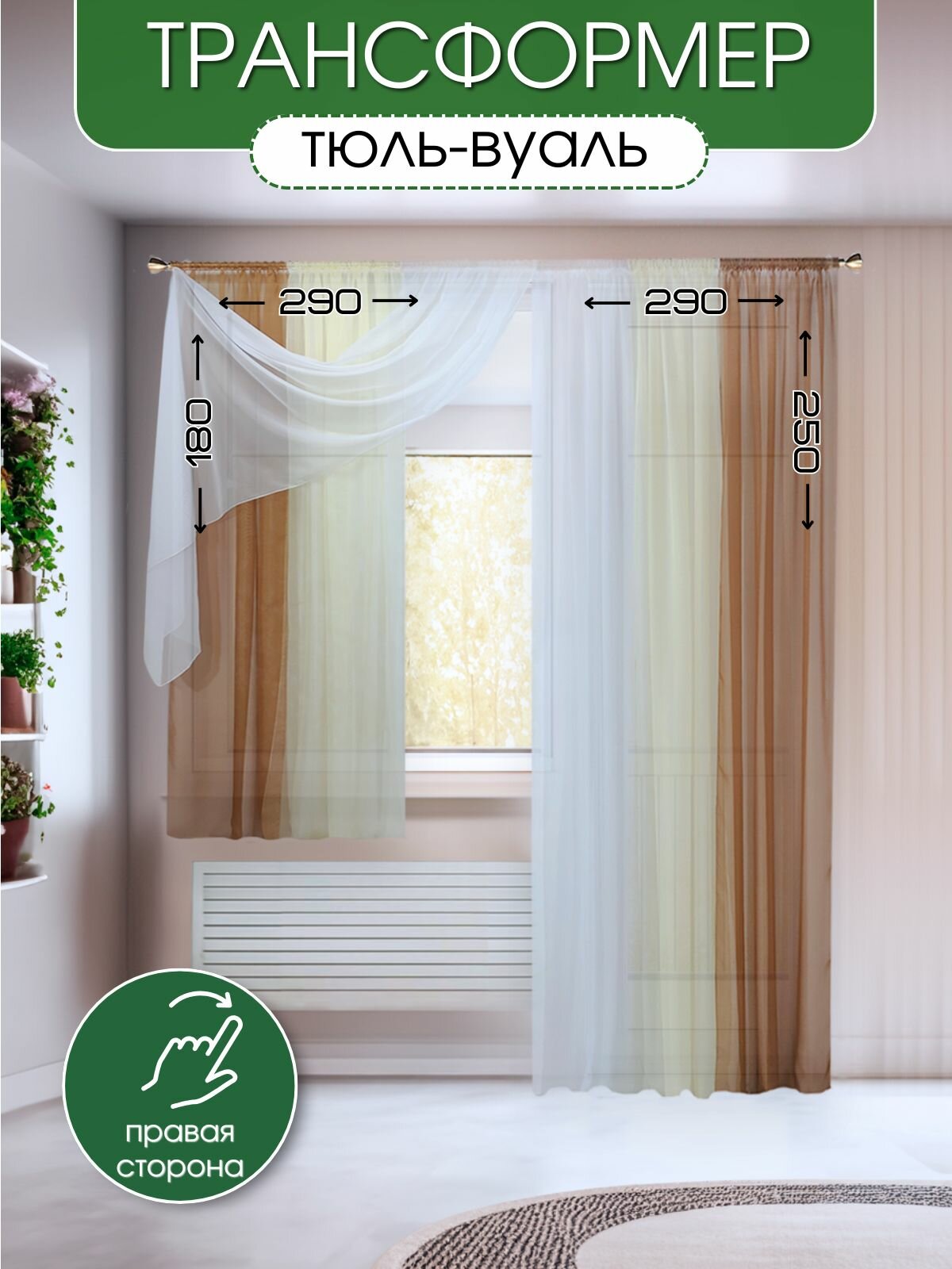 Длинные шторы для кухни "Домтекс 35", комплект из 2-х штор, 290х250 и 290x180, правая