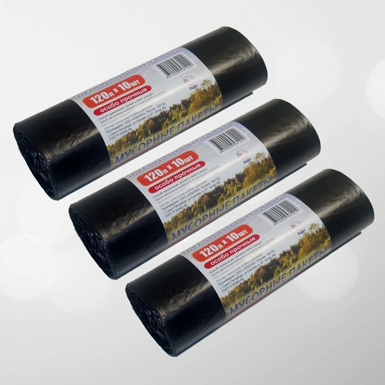 Купить Мусорные пакеты "мандаринка" 120 л по 10 шт, особо прочные, 16 мкм, 3 рулона, 30 шт, чёрные