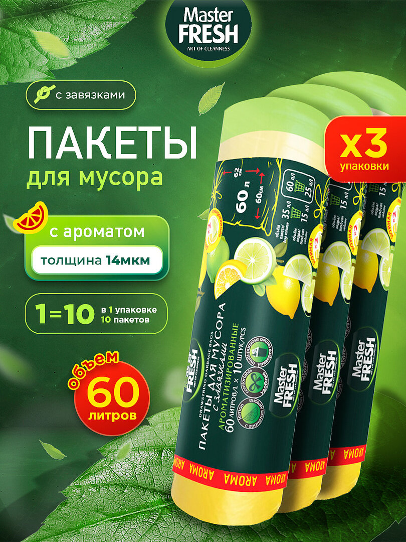 Пакеты для мусора Master Fresh набор с завязками арома желтые 14мк 60л/10шт*3шт интересное: