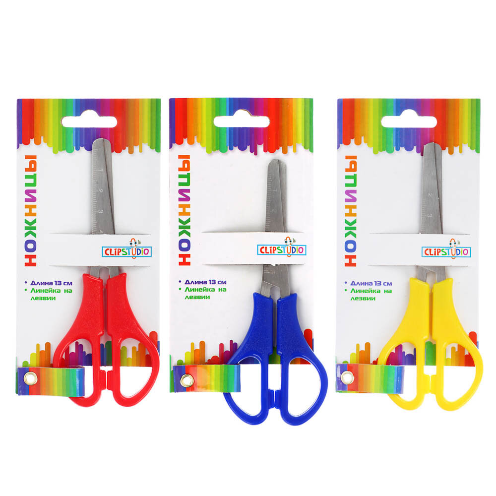 Купить 10 Ножниц канцелярских 13 см, пластиковые ручки, закруглённые концы с линейкой