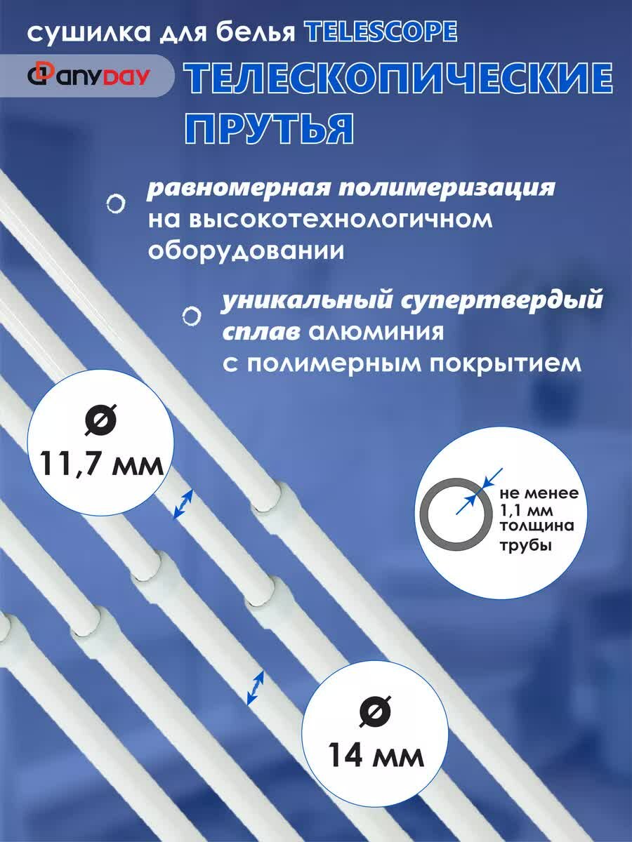 Сушилка для белья потолочная AnyDay Telescop 1,4-2,5 метра, 7 перекладин, белый
