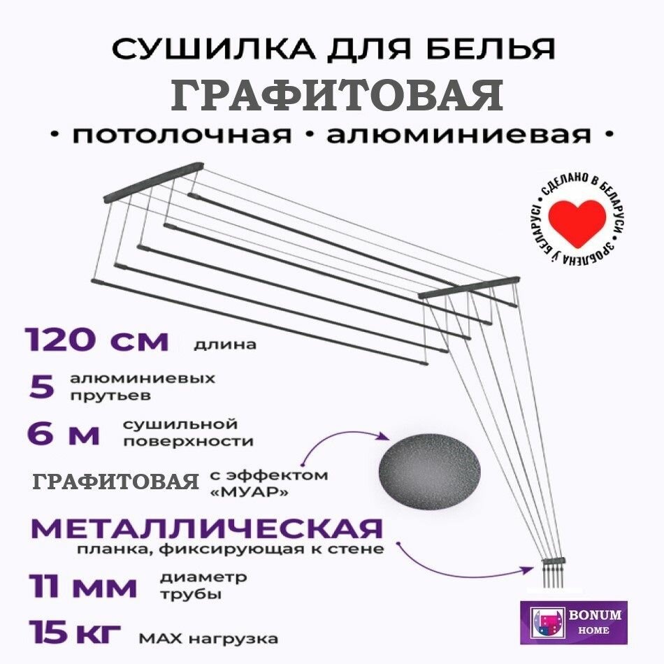 Сушилка для белья потолочная графит, навесная, алюминиевая-1,3м,5 прутьев. Беларусь