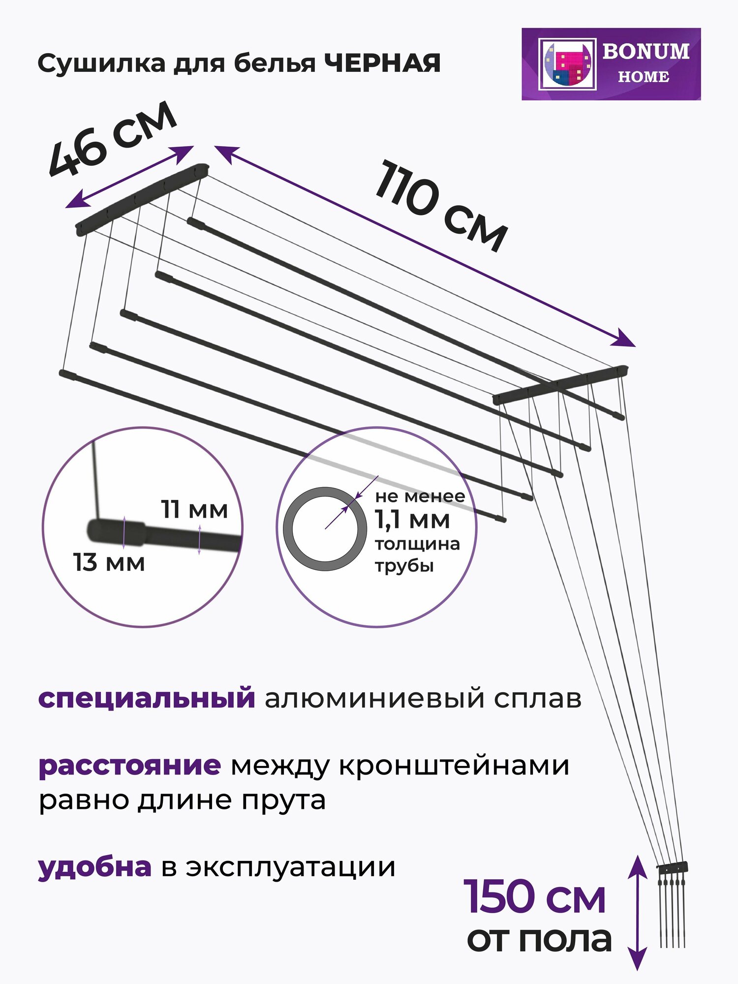 Сушилка для белья потолочная, черная 110см.7прутьев, навесная, алюминиевая. Беларусь.