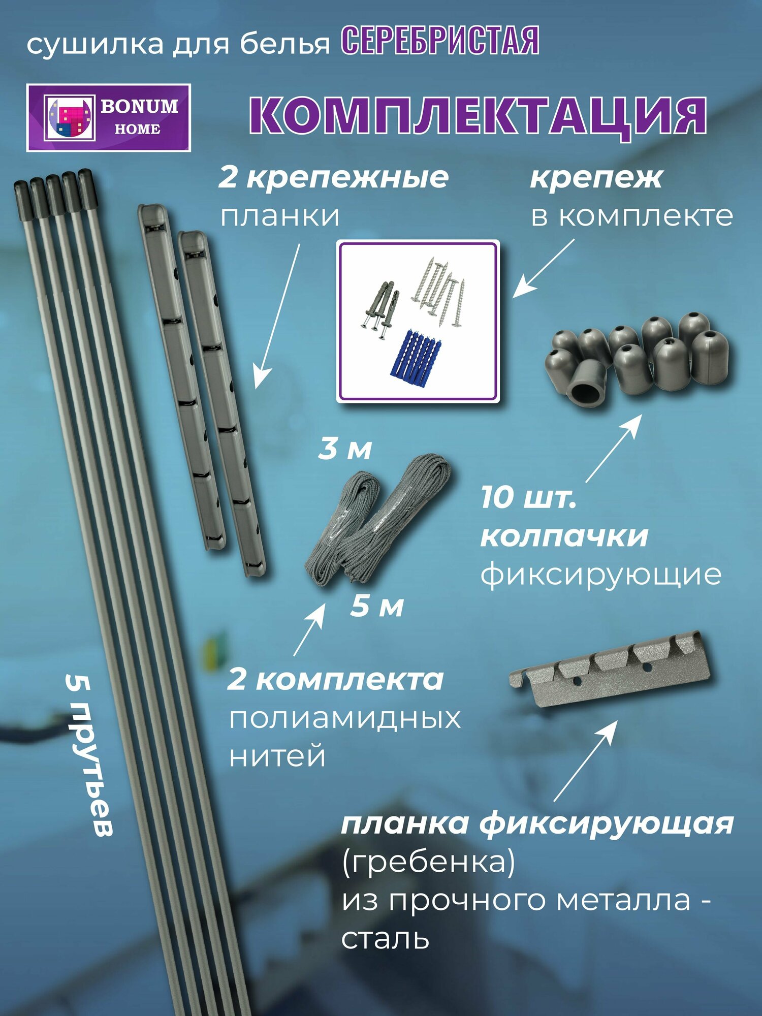 Сушилка для белья потолочная, серебристая, навесная, алюминиевая-1,1м,5 прутьев. Беларусь
