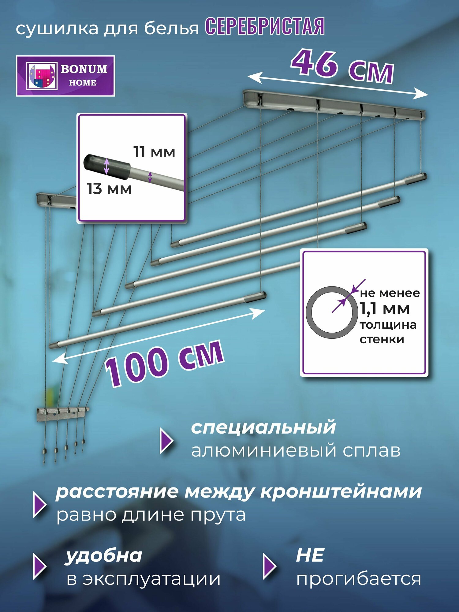 Сушилка для белья серебряная 100см.7 прутьев, потолочная, навесная, алюминиевая. Беларусь.