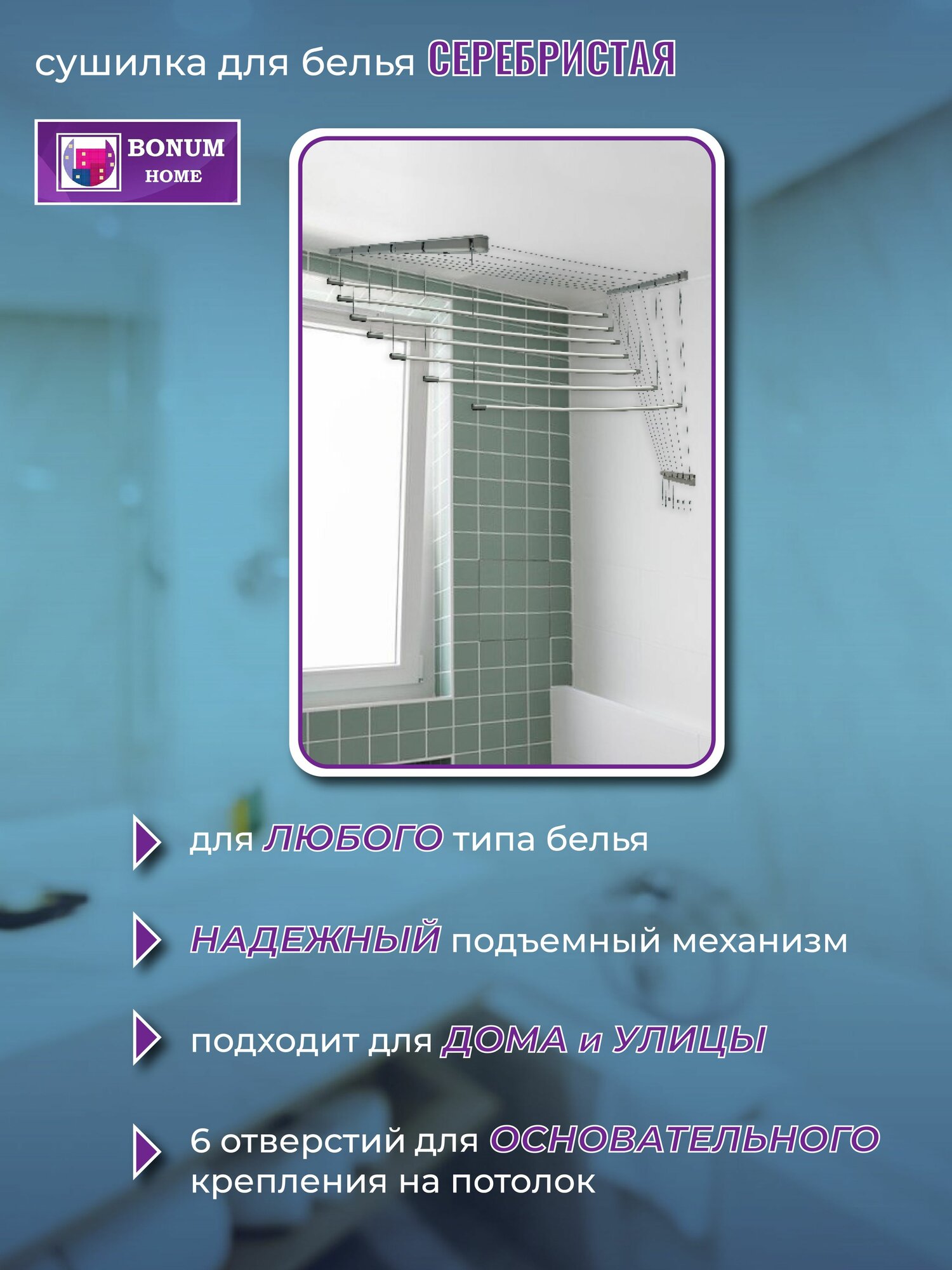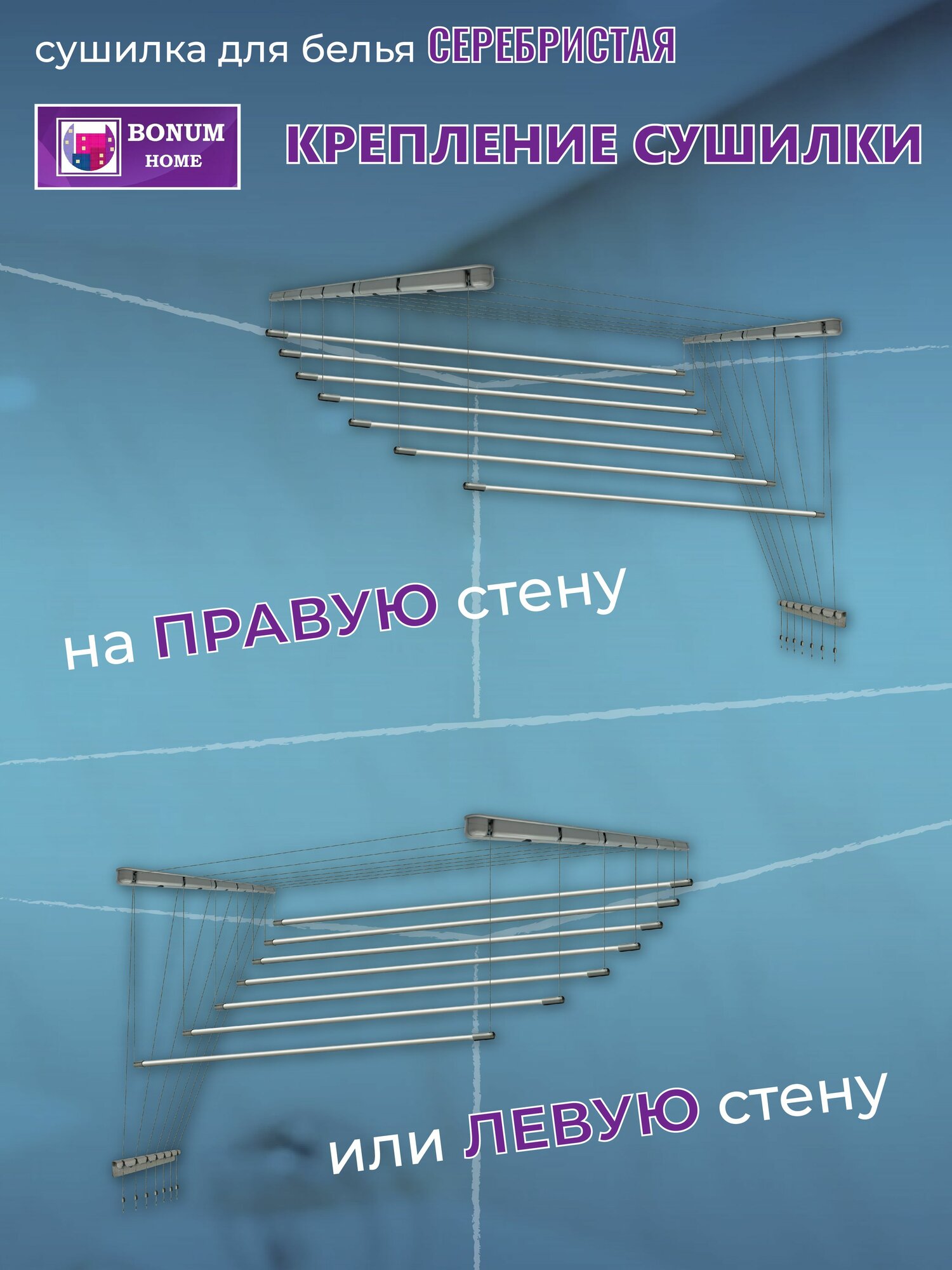Сушилка для белья потолочная, серебристая, навесная, алюминиевая-1м,5 прутьев. Беларусь