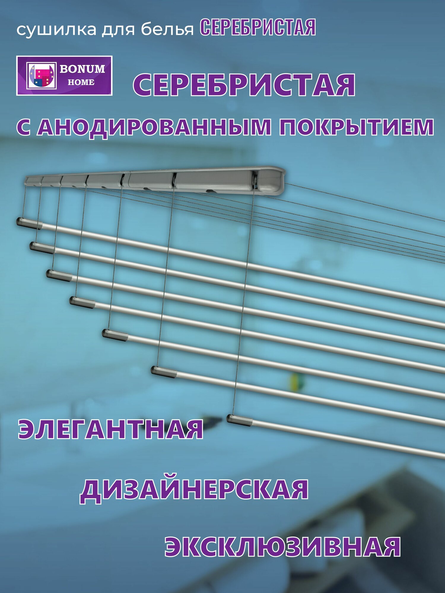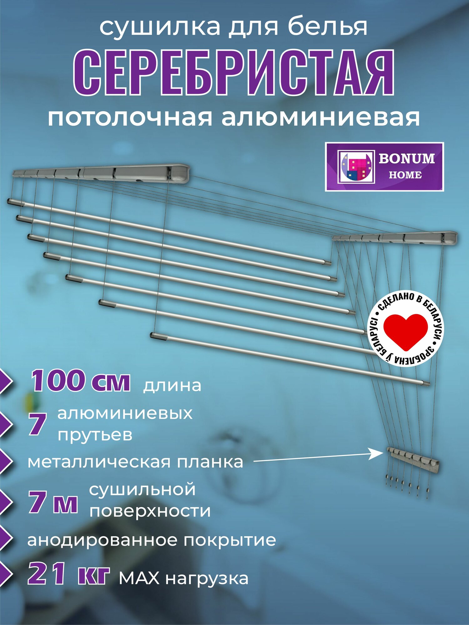 Купить Сушилка для белья серебряная 100см.7 прутьев, потолочная, навесная, алюминиевая. Беларусь.