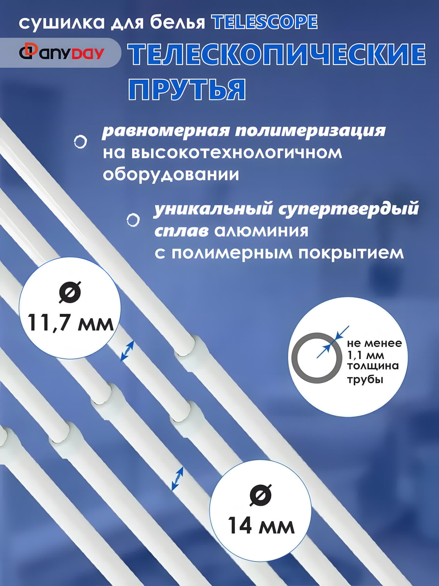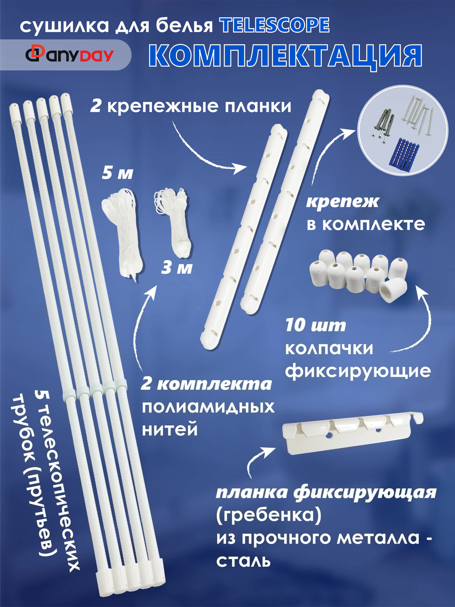 Сушилка для белья потолочная AnyDay Telescop 1,4-2,5 метра, 5 перекладин, белый