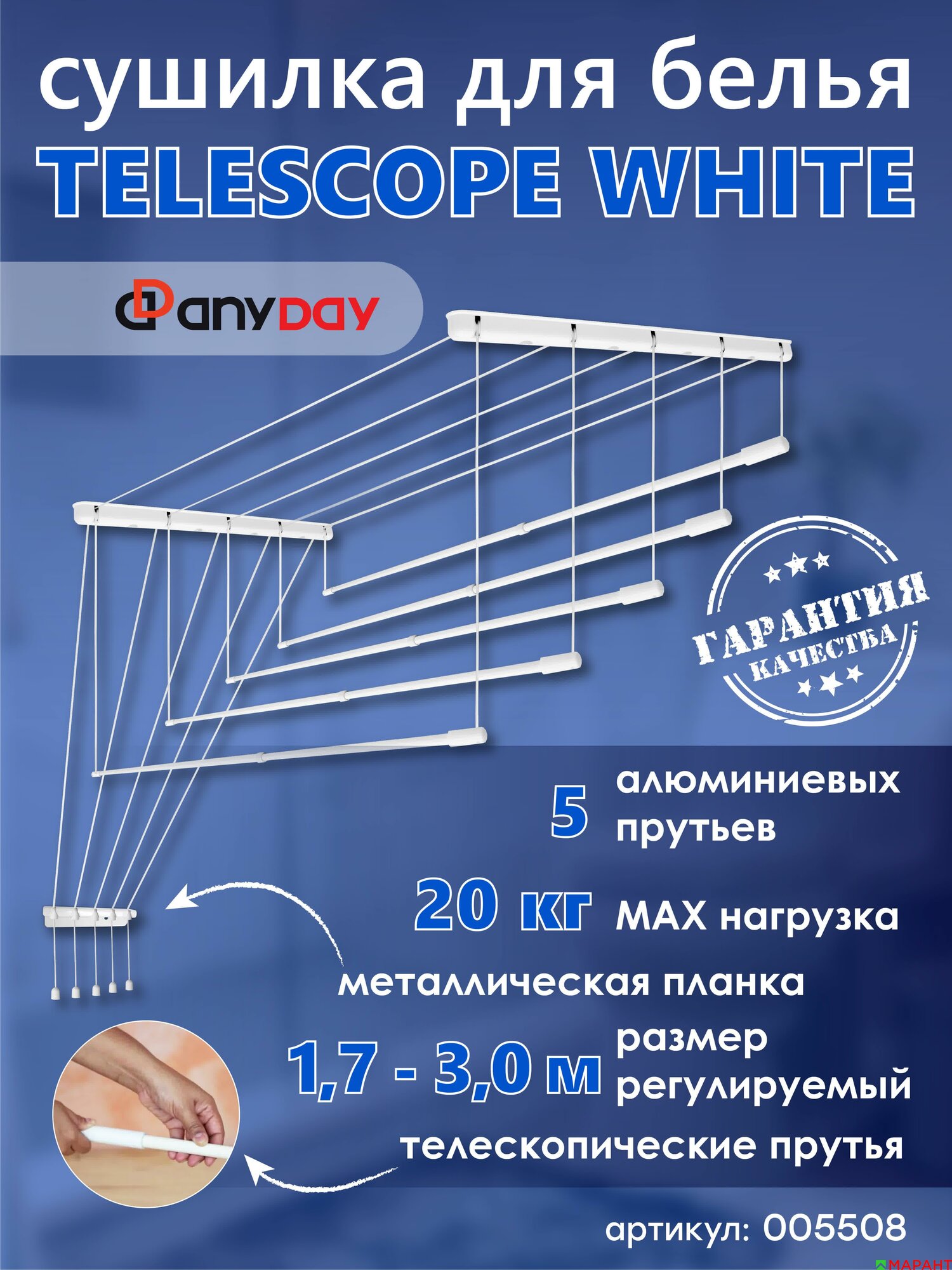 Купить Сушилка для белья потолочная AnyDay Telescop 1,7-3,0 метра, 5 перекладин, белый