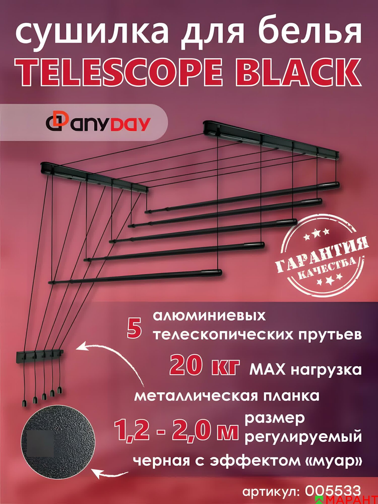 Сушилка для белья потолочная AnyDay Telescop 1,7-3,0 метра, 5 перекладин, черный