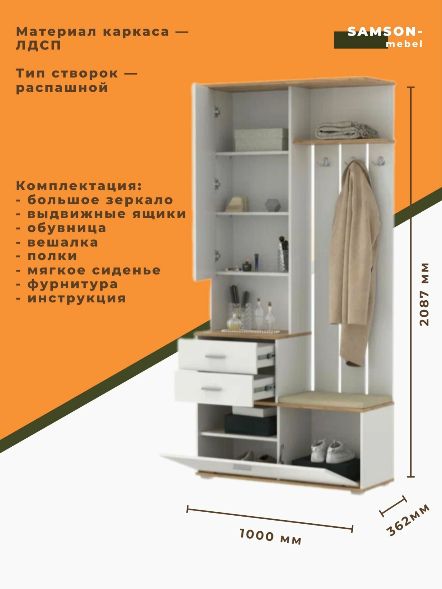 Прихожая ДОМИНО-1, белый, зеркало, мягкое сиденье, 1000х360х2080 интересное: