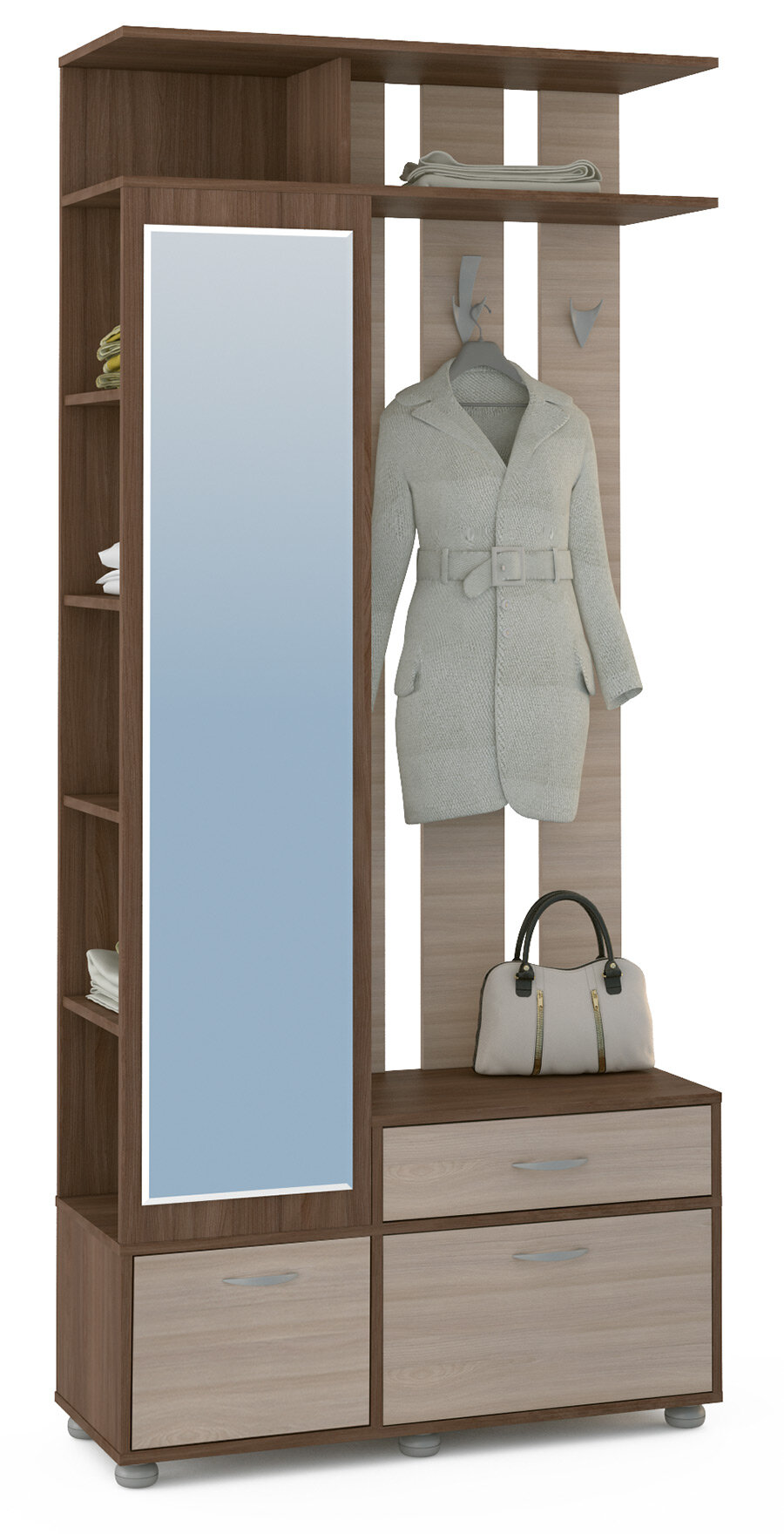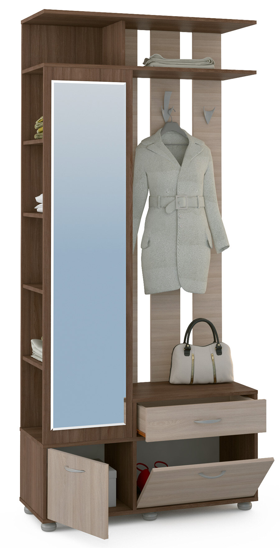 Прихожая комплект САША-6 (правая) от Фант-Мебель, с зеркалом, с обувницей, шкафом и ящиками, 156x203,6x43 см. Ясень темный/Ясень светлый