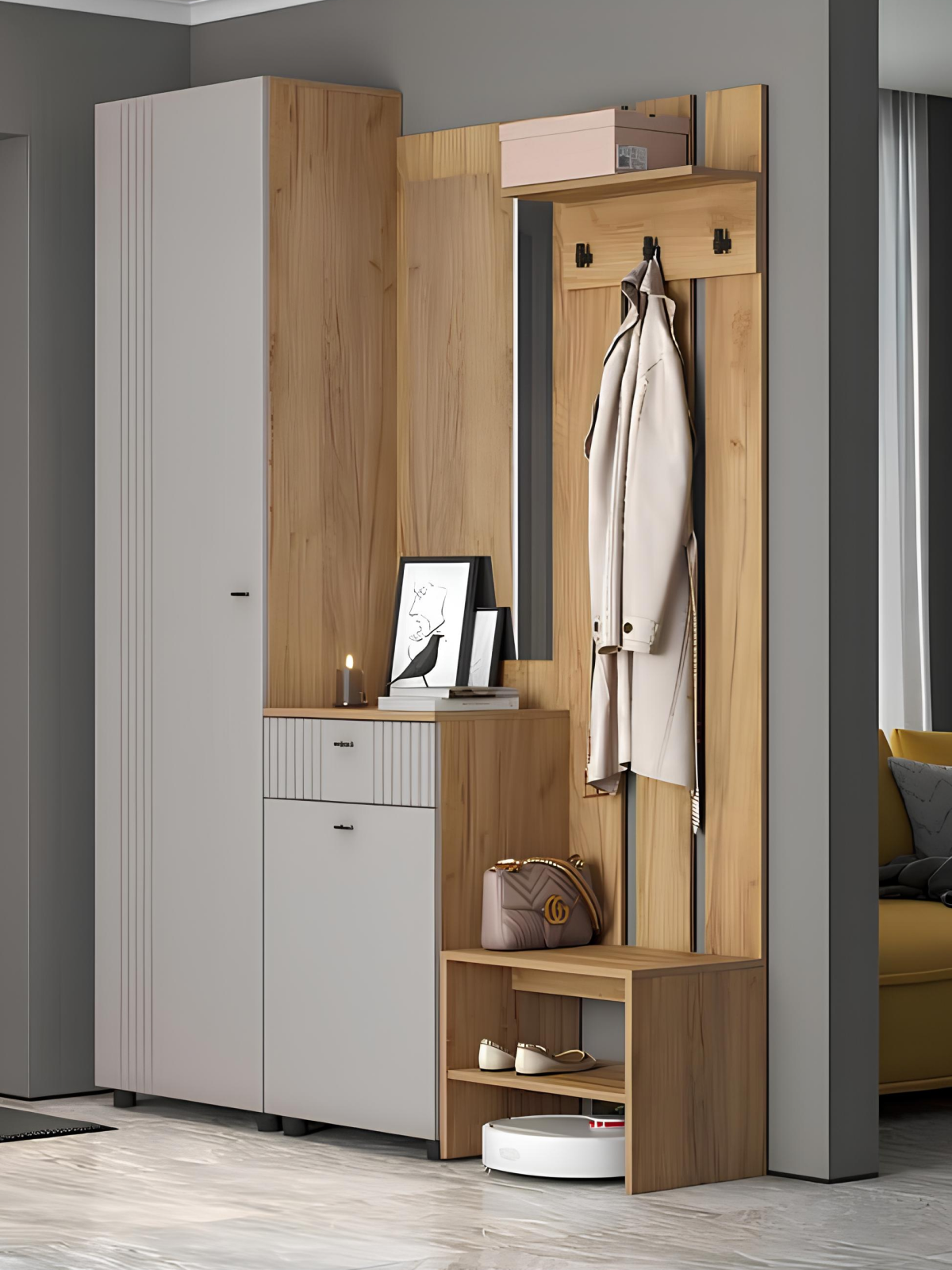 Прихожая комплект САША-6 (правая) от Фант-Мебель, с зеркалом, с обувницей, шкафом и ящиками, 156x203,6x43 см. Ясень темный/Ясень светлый