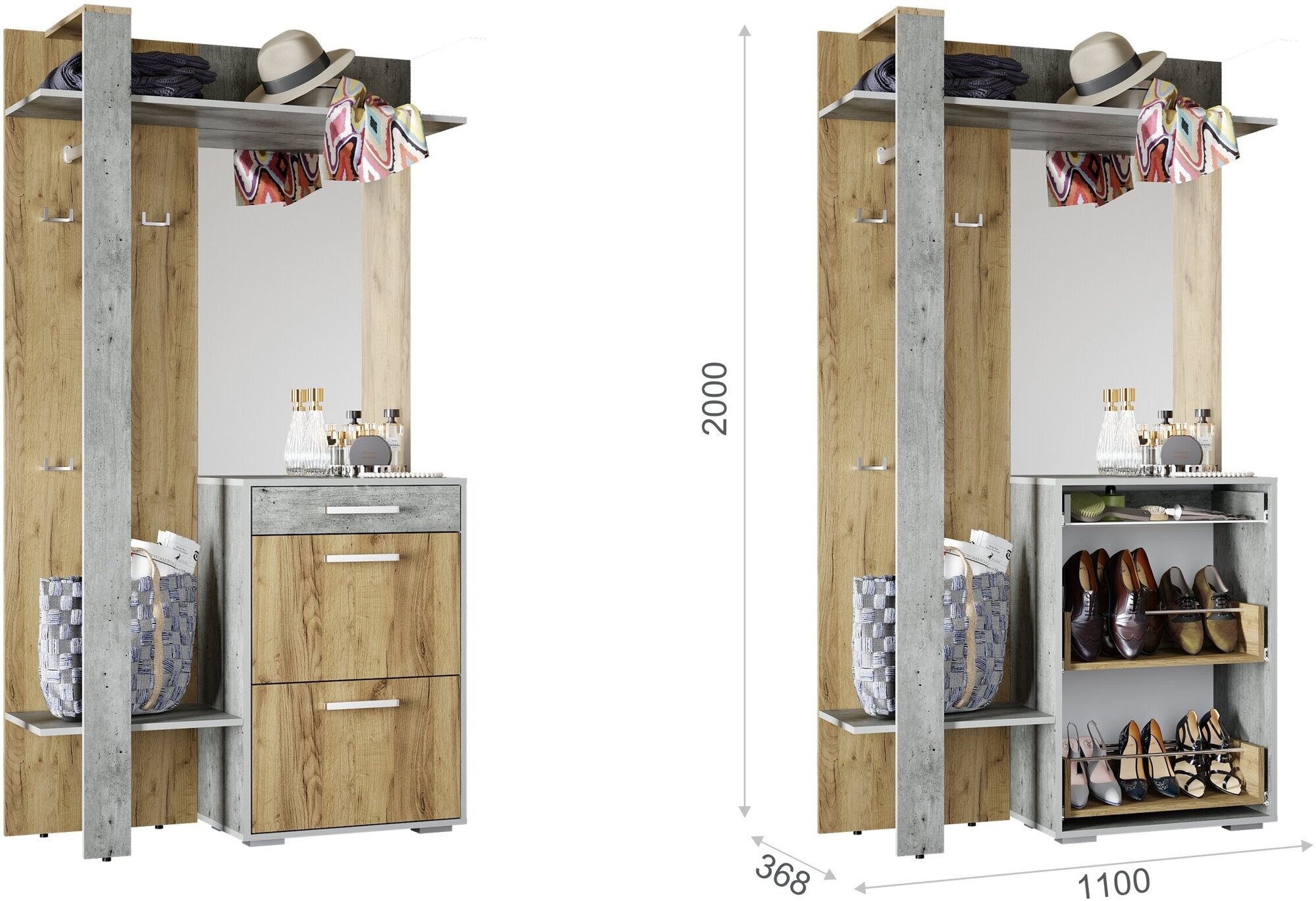 Прихожая комплект САША-6 (правая) от Фант-Мебель, с зеркалом, с обувницей, шкафом и ящиками, 156x203,6x43 см. Ясень темный/Ясень светлый