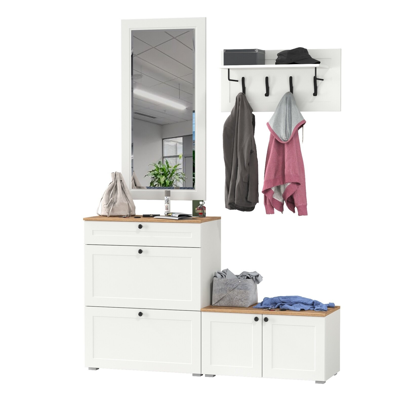 Прихожая комплект САША-6 (правая) от Фант-Мебель, с зеркалом, с обувницей, шкафом и ящиками, 156x203,6x43 см. Ясень темный/Ясень светлый