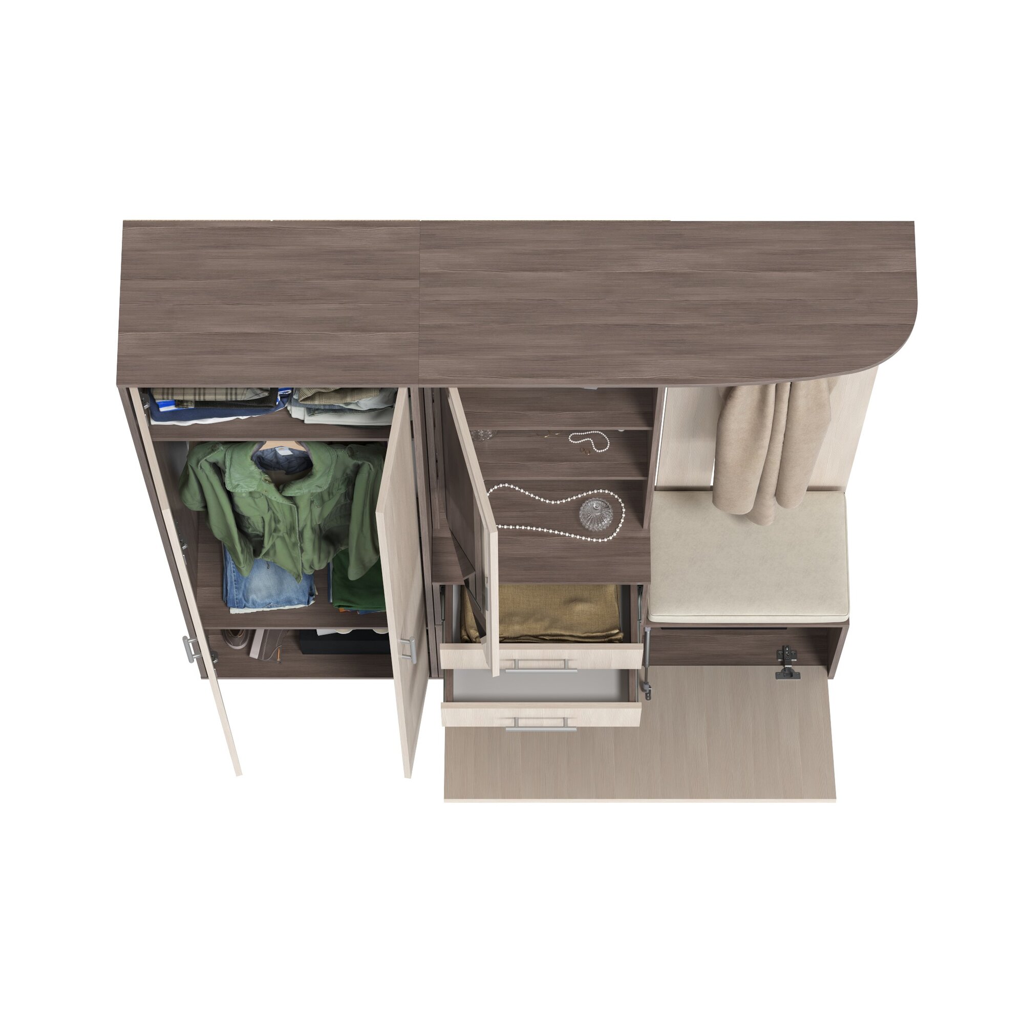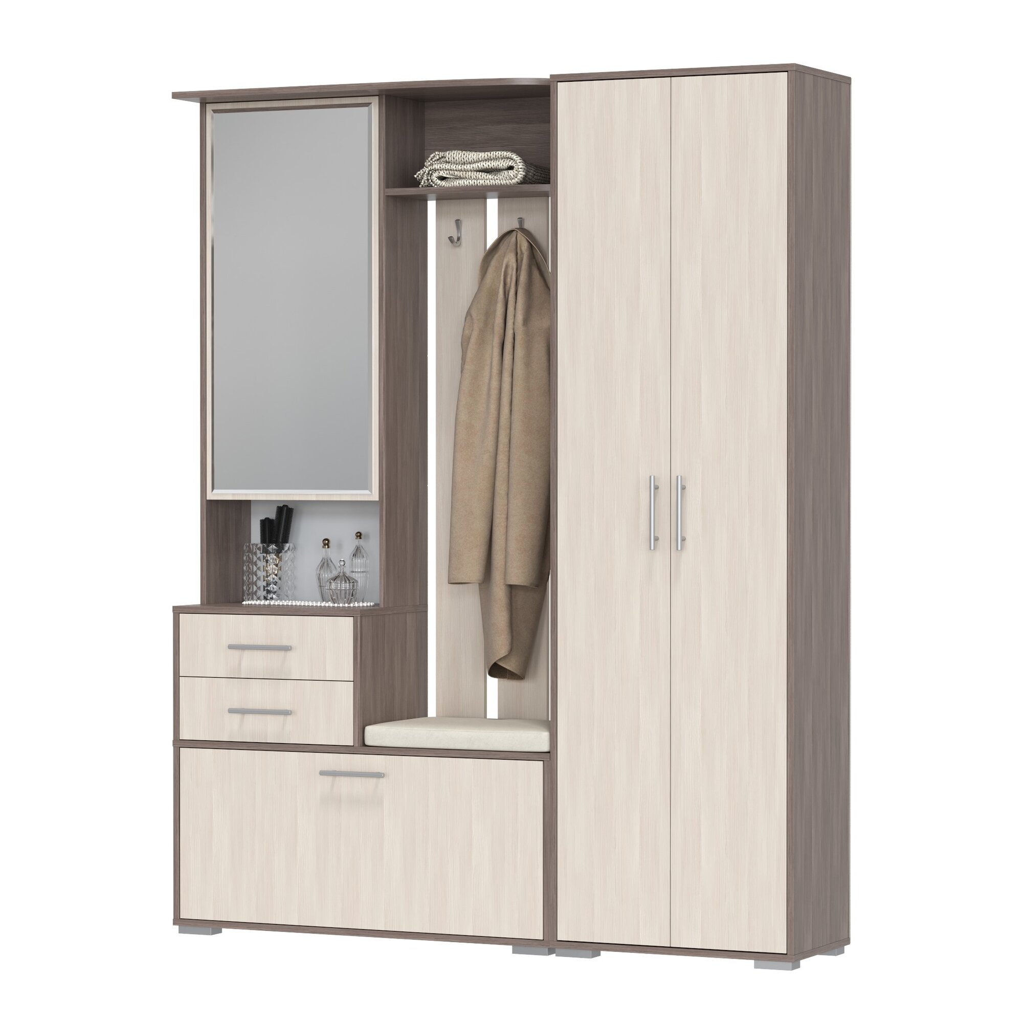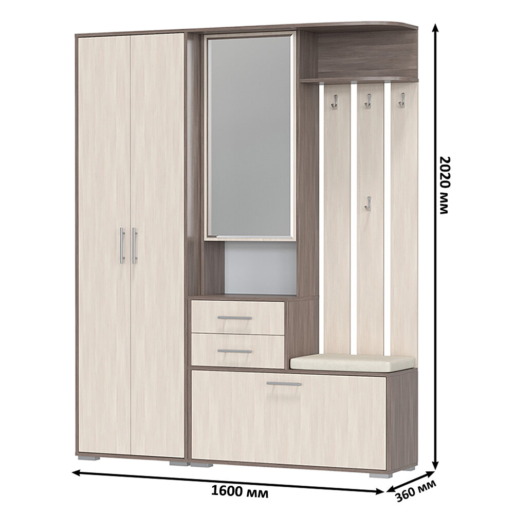 Прихожая комплект САША-6 (правая) от Фант-Мебель, с зеркалом, с обувницей, шкафом и ящиками, 156x203,6x43 см. Ясень темный/Ясень светлый