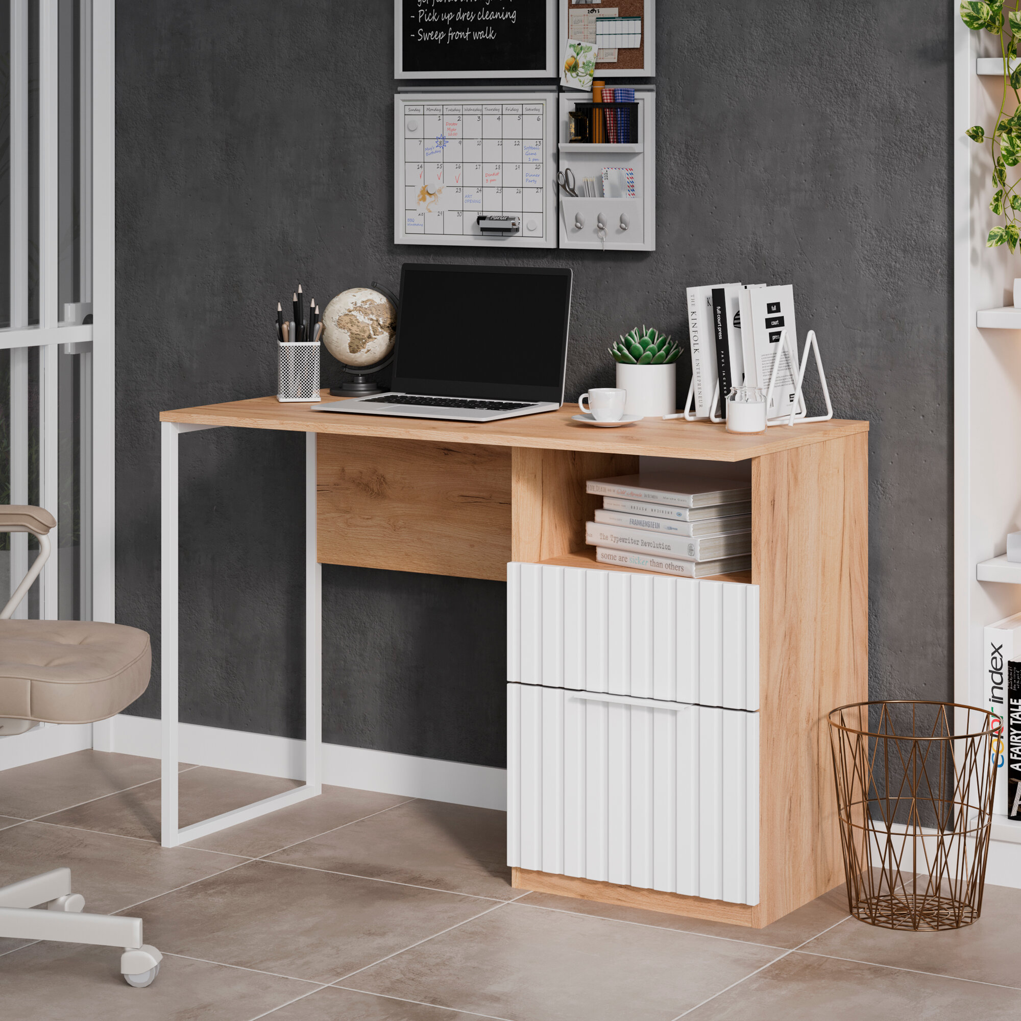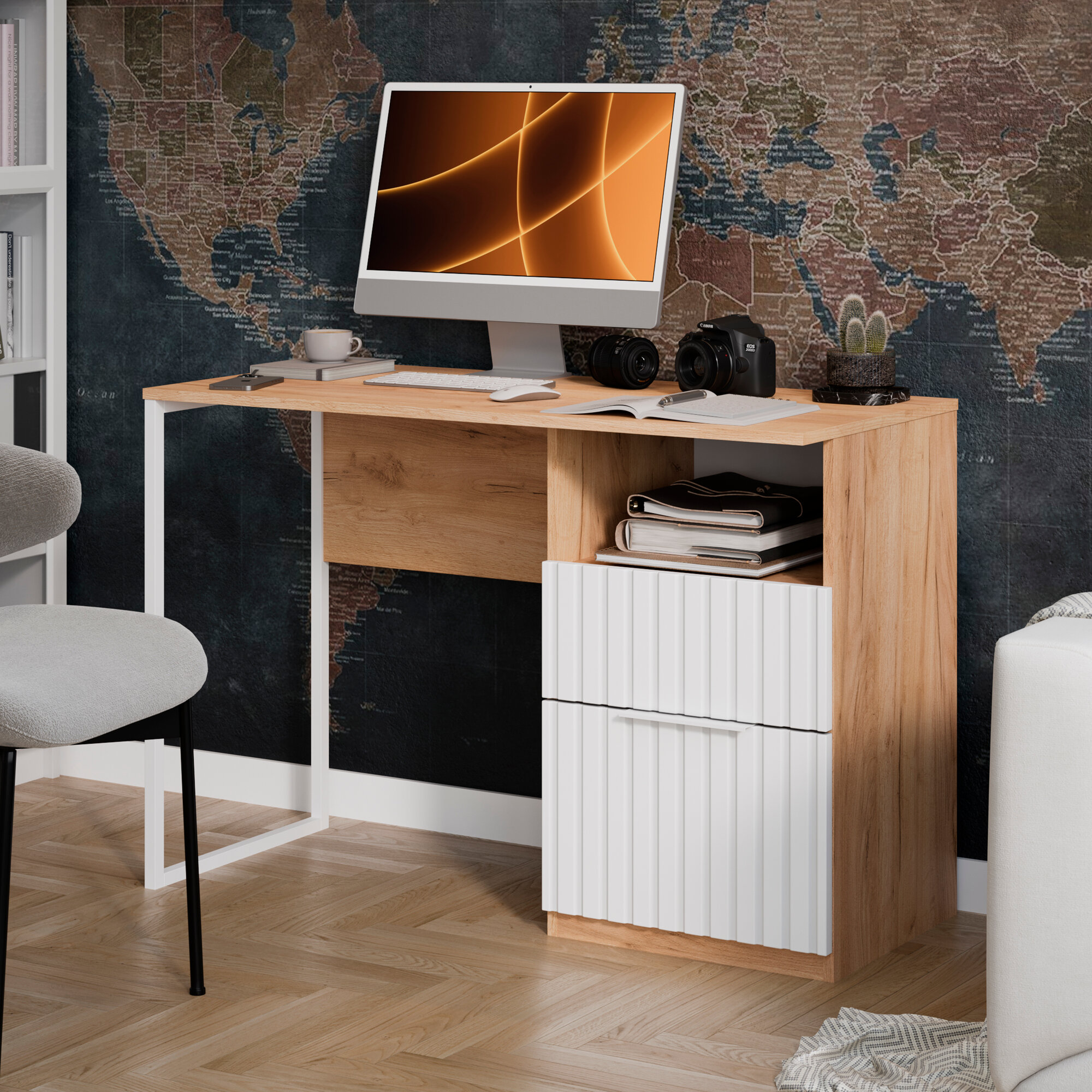 Купить Письменный стол , компьютерный с ящиками и полкой Хилтон ( Дуб Крафт Золотой/Белый матовый)