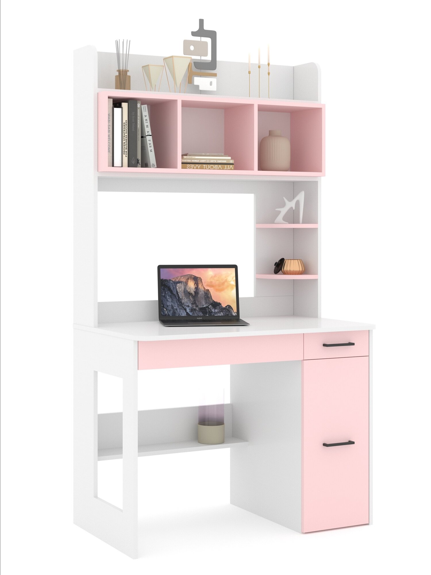 Купить Стол письменный с надстройкой, с полками, с ящиком Есэндвич ART Лаворо 100х180х60 см, правый (Белый/Розовый кварц)