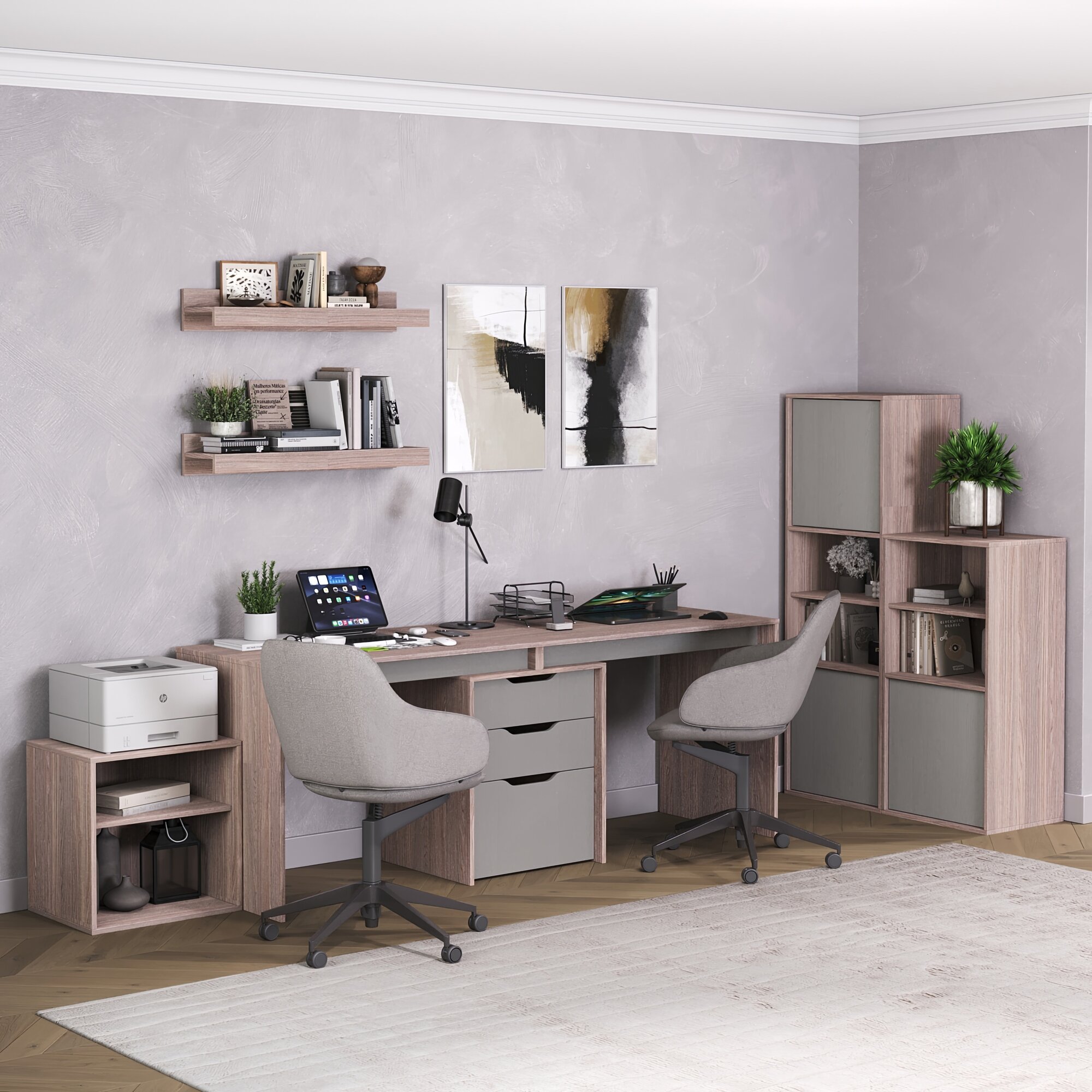 Письменный стол двойной, с тумбой, с ящиками Double Grand Лаворо 220х60х75 см (Дуб бунратти/Вулканический серый)