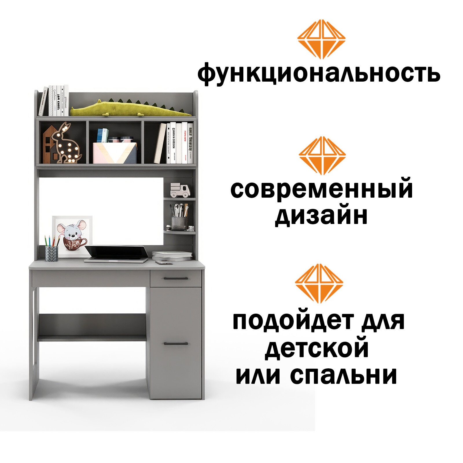 Стол компьютерный с надстройкой, с полками, с ящиком Есэндвич ART Лаворо 100х180х60 см, правый (Вулканический серый)