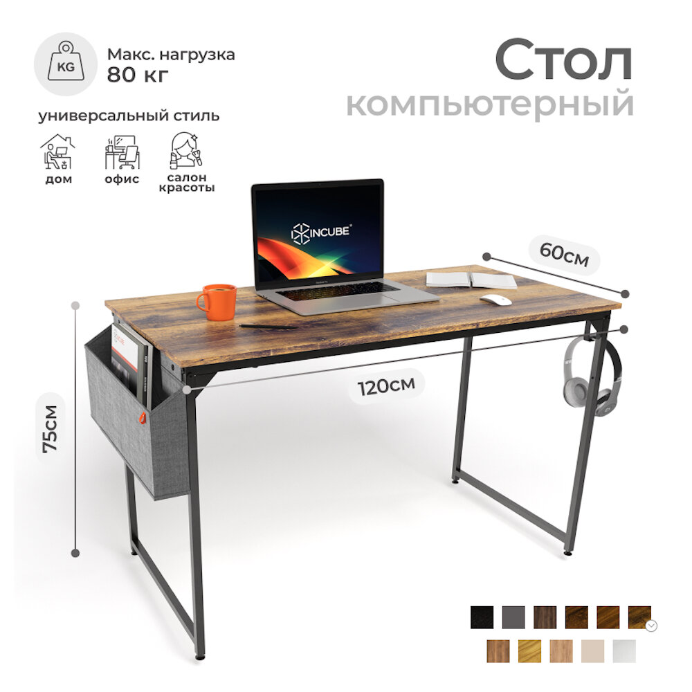 Стол письменный, компьютерный лофт INCUBE D002.120. DRST, темный рустик, 120х60х75см, с органайзером, ЛДСП, металл