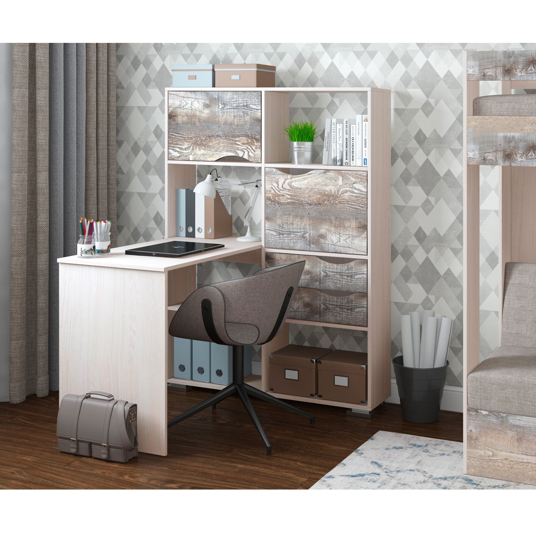 Письменный стол угловой Есэндвич Лаворо, 110x110х150 см, левый, Анкор светлый/Вулканический серый