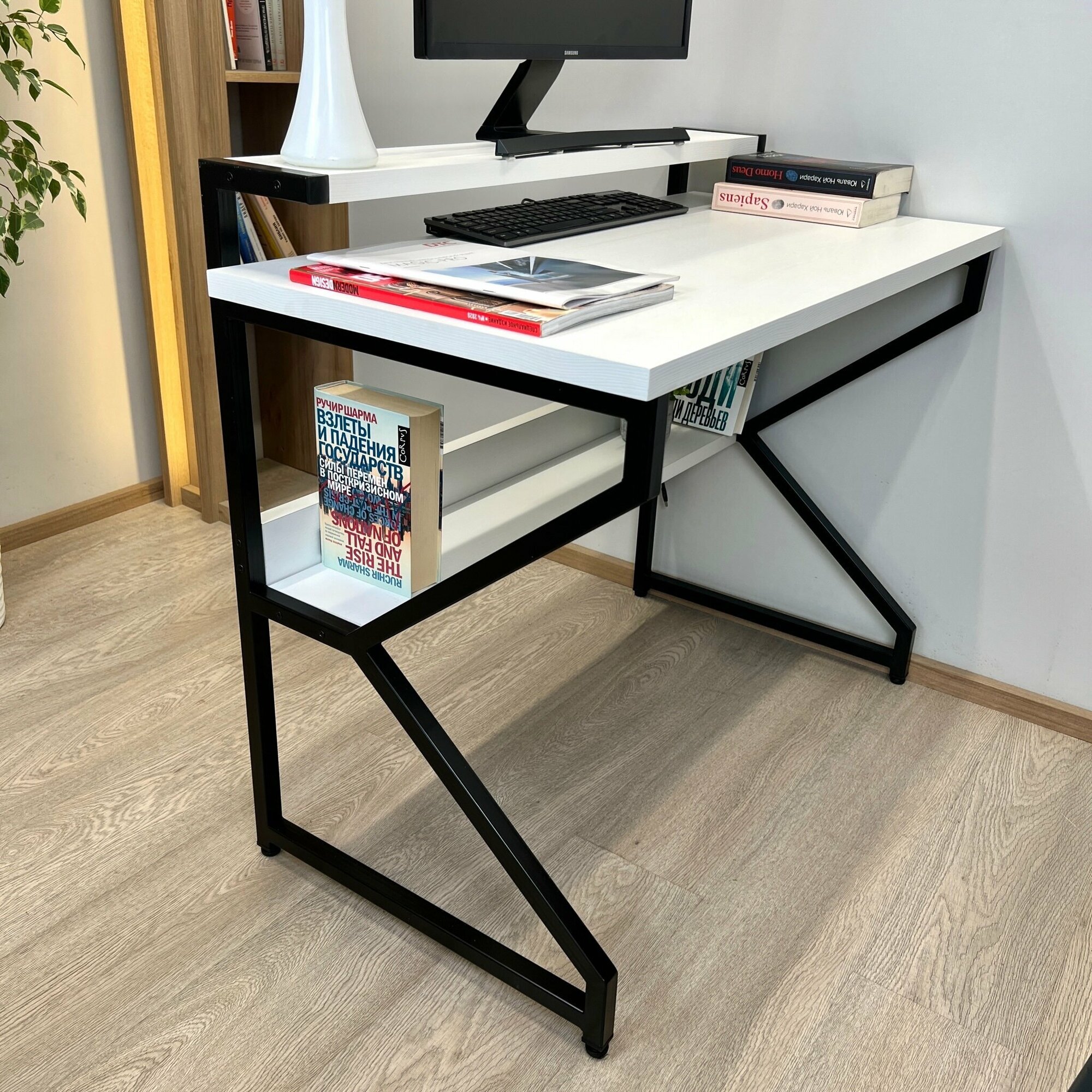 Компьютерный стол REX 85х60х75 (белый) LOFT, игровой стол с дополнительными полками