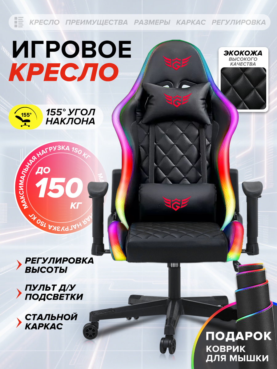 Купить Игровое кресло /Кресло руководителя, FONLUX 1207RGB-черный, металлический каркас, регулируемый подлокотник и спинка