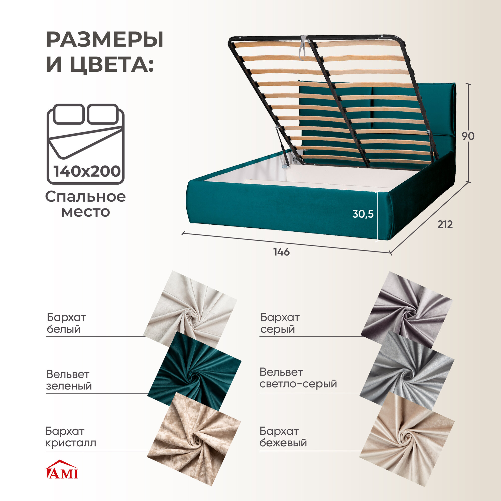 СохранитьДвуспальная кровать 140х200 с подъемным механизмом Британия для дома и спальни, вельвет бирюзовый, Ами Мебель интересное: