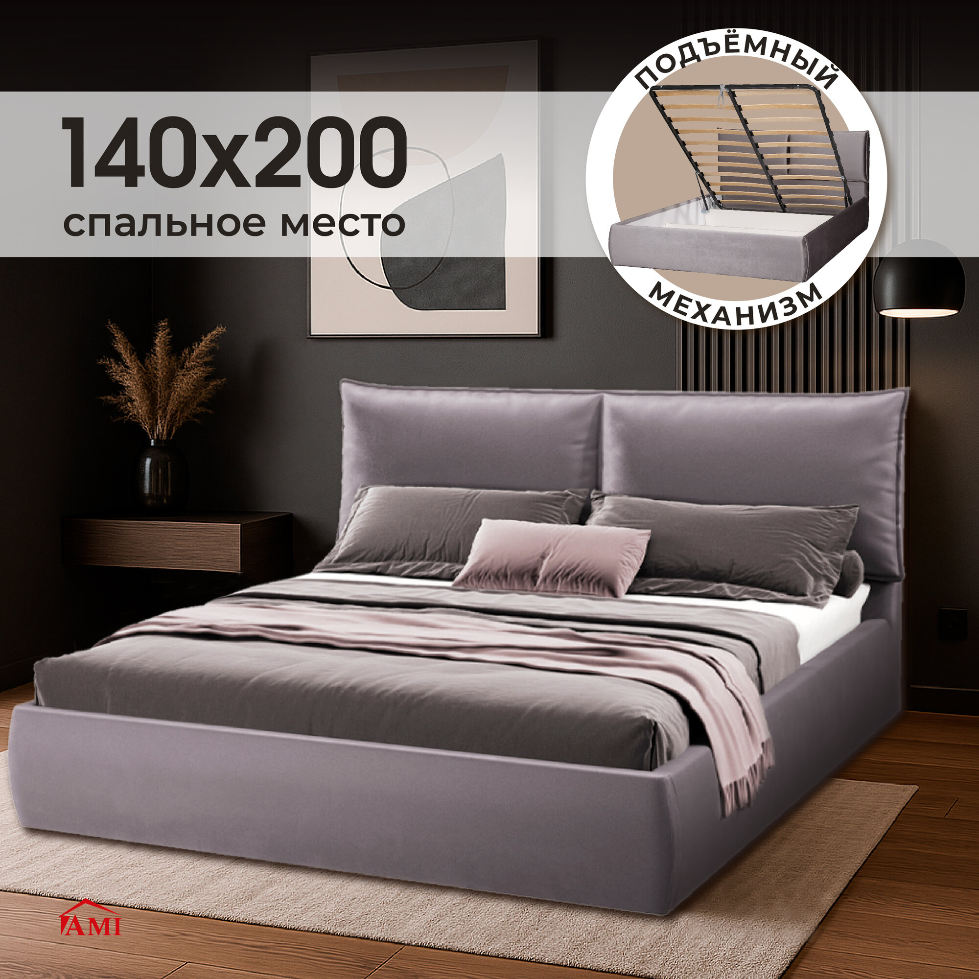 Купить Двуспальная кровать 140х200 с подъемным механизмом Британия для дома и спальни, бархат серый, Ами Мебель