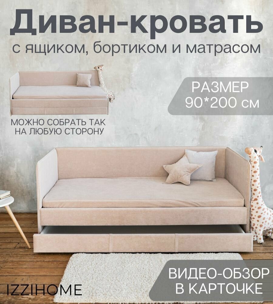 Купить Детский диван-кровать 90*200 см SMILE бежевый с ящиком, защитным бортиком, матрасом и чехлом в цвет дивана