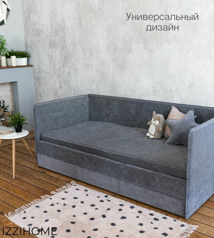 Купить Детский диван-кровать 90*200 см SMILE темно-серый с ящиком, защитным бортиком, матрасом и чехлом в цвет дивана