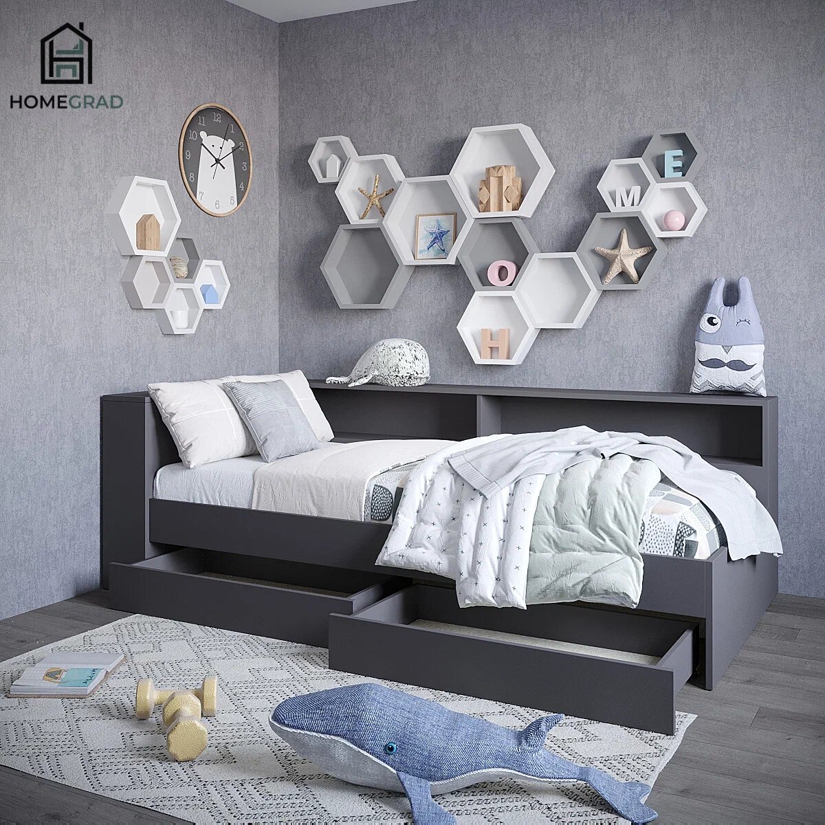 Кровать с ящиками и прикроватным блоком Ksenia 90х200, графит, HomeGrad интересное: