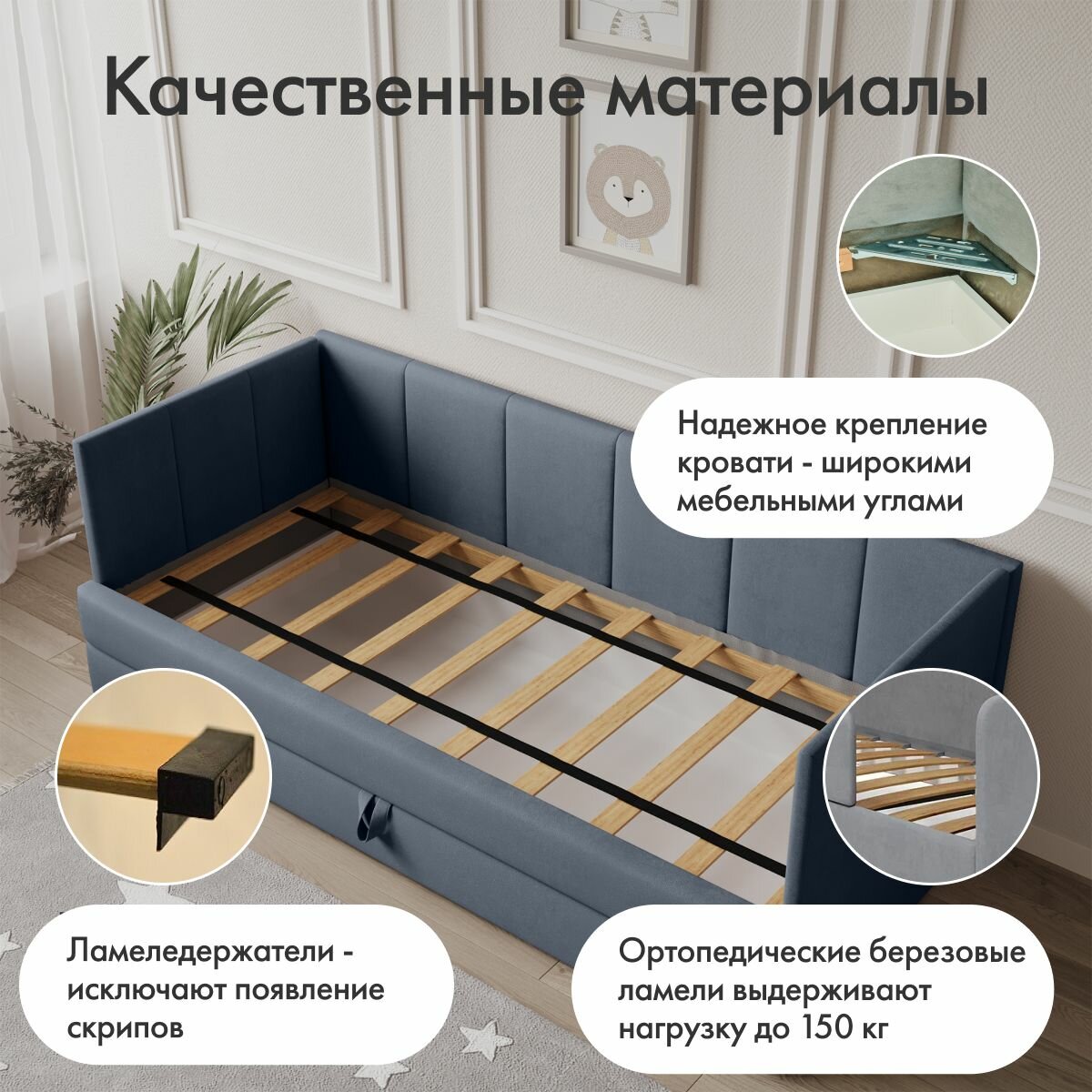 Детский диван кровать Челси 160х80 см голубой с матрасом, чехлом, выкатным ящиком и бортиком Кровать детская от 3х лет