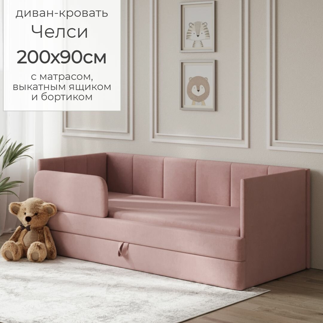 Купить Детский диван кровать Челси 90х200 см розовый с матрасом, чехлом, выкатным ящиком и бортиком Кровать детская от 3х лет